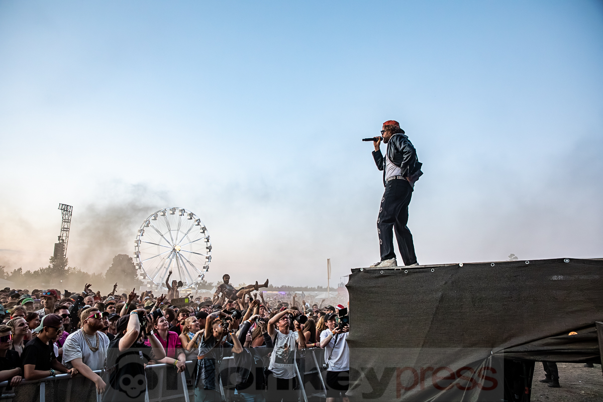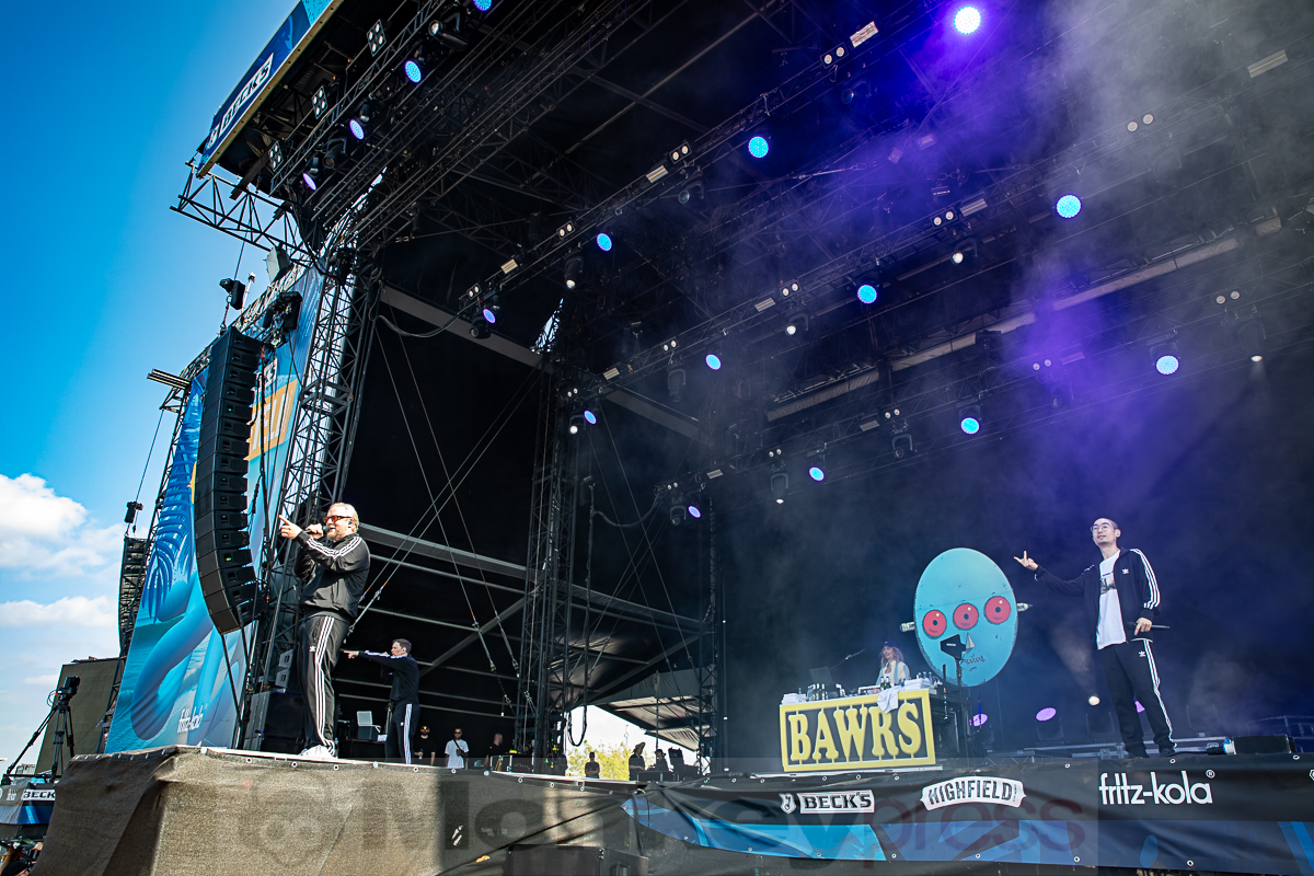 Die Blue Stage war nun Schauplatz von gleich drei Rappern, die gemeinsame Sache machten. Fatoni, Edgar Wasser & Juse Ju kamen zur Titelmusik vom A-Team auf die Bühne und ließen sich feiern. Mit „Beste Kombi“ starteten sie in ihr Set und im Publikum wippten die Arme im Takt der Musik auf und ab. Hinter den Jungs war ein großes Aliengesicht zu sehen, das auch auf dem gemeinsamen Album „BAWRS“ abgebildet ist. Darunter stand DJane Jenny, die für den Sound verantwortlich war. Die drei Sänger trugen alle einen Adidas-Jogginganzug und standen nicht einen Moment still. Mit einem Track über „eine sehr gute Supermarktkette“ ging es weiter – „7 Eleven“ wurde mitgesungen. Außerdem mussten alle in die Hocke gehen und dann zusammen mit den Drei in die Luft springen. Wie ihr euch denken könnt, erzeugte das wieder einmal eine Staubwolke, so dass die Bühne kurzzeitig kaum zu erkennen war. Das Trio hatte seinen Spaß – das war ihnen anzusehen. So ließ sich Fatoni rückwärts in die Arme eines seiner Kollegen fallen – sie vertrauten sich schier blind. Und weil es so wild zuging, zogen sie nach und nach ihre Jacken aus, um noch ausgelassener auf der Stage hin und her agieren zu können.