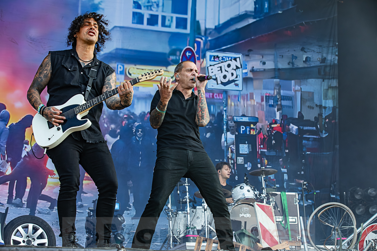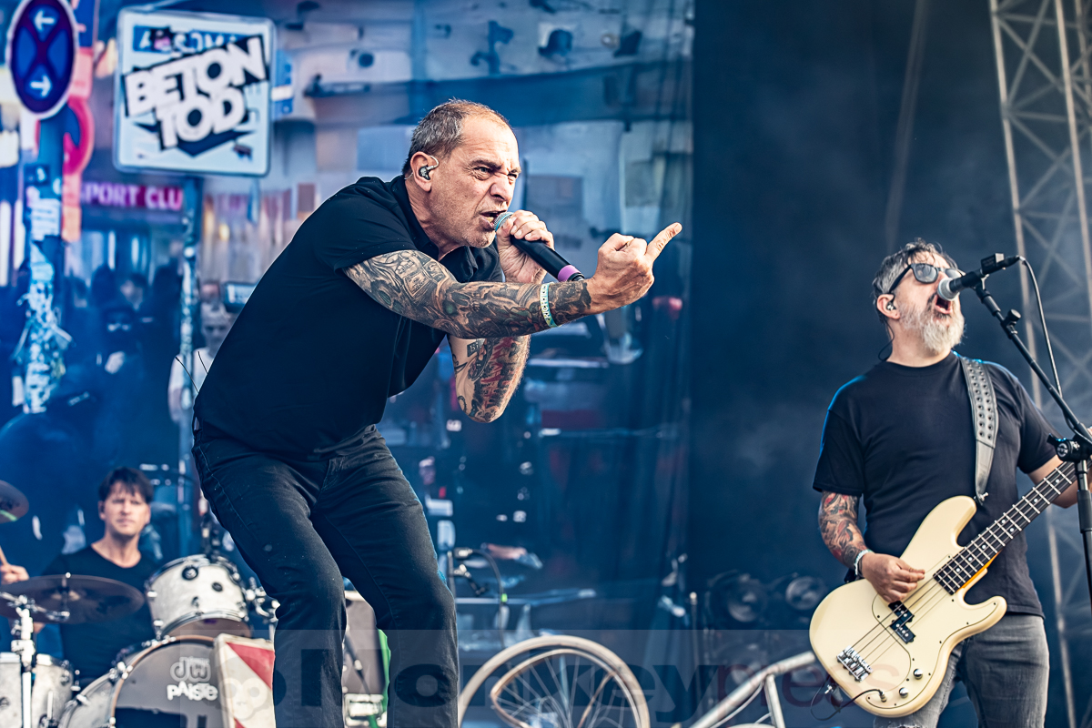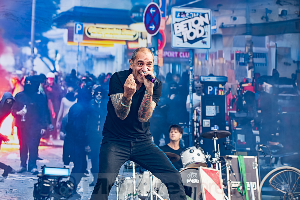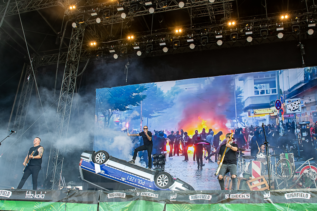 Die Green Stage war an diesem Tag sehr punklastig, was uns gefiel, und so waren wir dann auch direkt bei Betontod mit am Start. Wir hatten die Band bisher noch nicht live miterleben können und so waren wir gespannt. Und wir wurden nicht enttäuscht. Hier waren Barrikaden zu sehen, im Hintergrund wurden Straßenkampfszenen gezeigt und ein Polizeiauto, das auf dem Dach lag, wurde zum ersten Stück enthüllt. Mit einer Sirene ging es los und dann wurde abgerockt. Frontmann Oliver sang „Das Kapital“ durch ein Megaphon. Das war echter Punk! „Ihr seid heute Nachmittag mein Chor“, so seine Aufforderung ans Publikum und diese ließen sich das nicht zweimal sagen. Es wurde immer wieder lautstark mitgebrüllt. Die Musiker machten mit dem nächsten Track noch einmal klar, dass sie immer noch „Keine Popsongs“ spielen würden. Das war auch ganz gut so. Diesen Rockern würden wir das auch nicht abnehmen. Mehrere Pits wirbelten Staub auf, während der Sänger auf den Boxen im Bühnengraben hin und her lief. Wieder schossen Luftschlangen durch die Luft und heizten noch mehr ein. Es ging mächtig ab – vor und auf der Stage. Die Herren verausgabten sich schier. Weitere Hits an diesem Tag waren „Tanz den Algorithmus“ und „Glück Auf!“. Geile Nummer, die nach einer Wiederholung schreit.