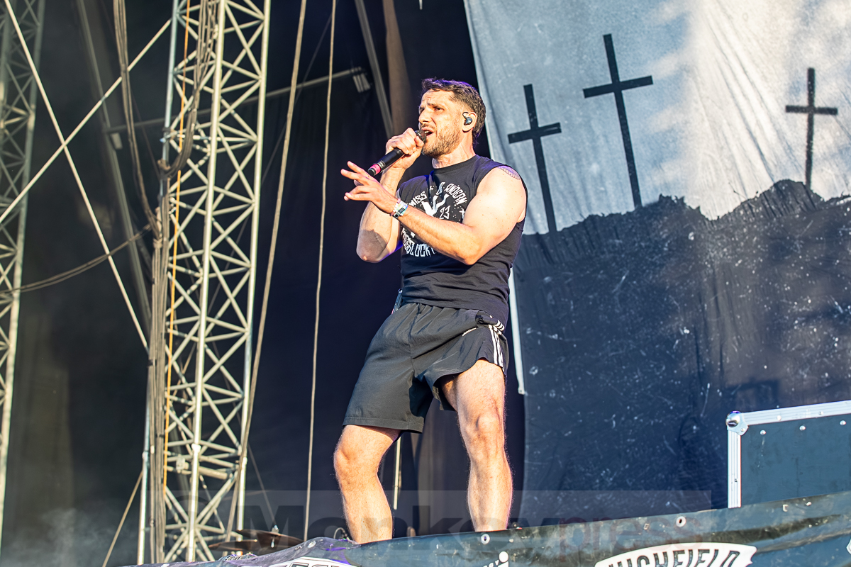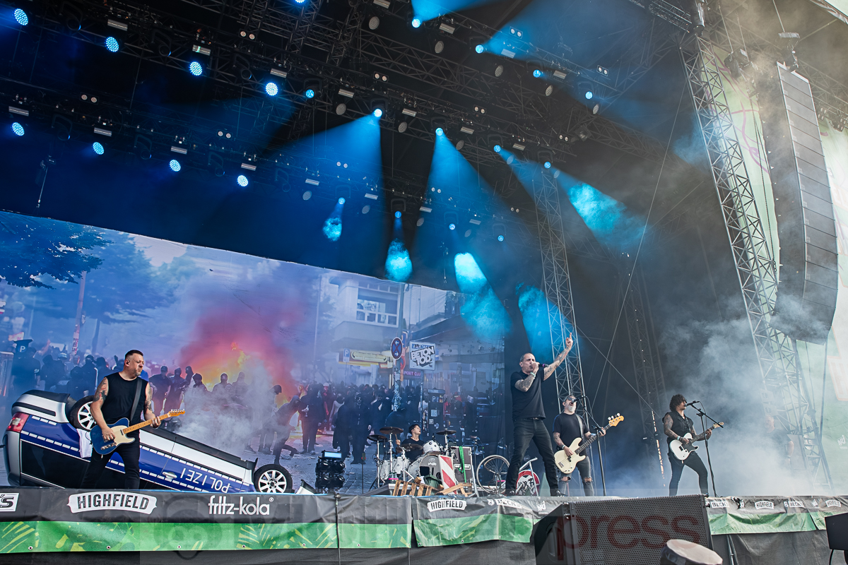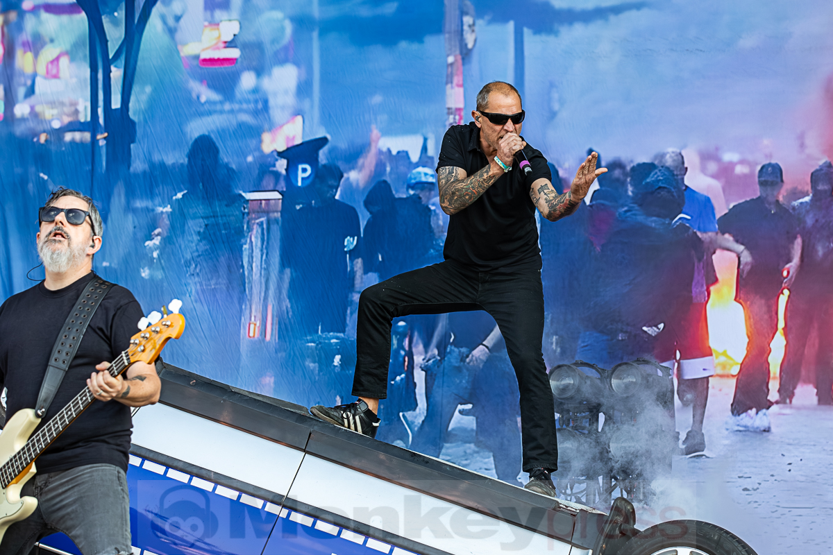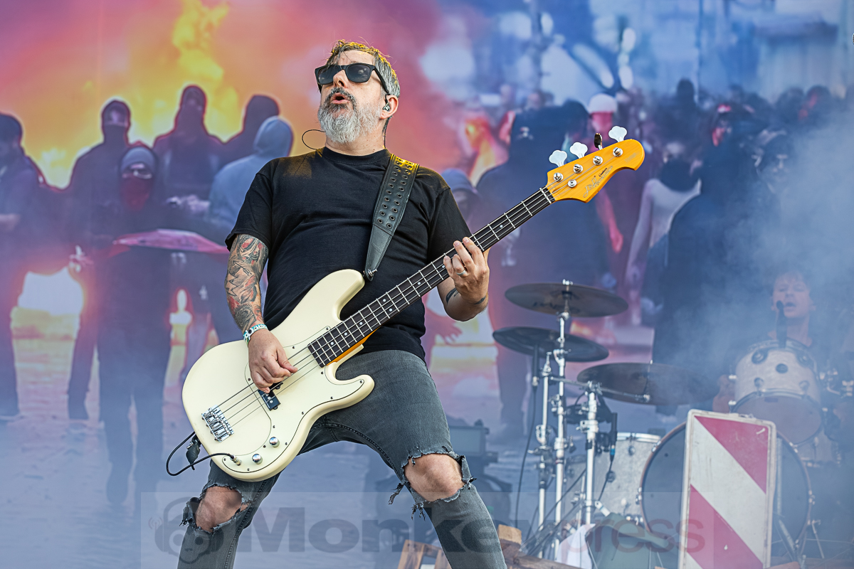 Die Green Stage war an diesem Tag sehr punklastig, was uns gefiel, und so waren wir dann auch direkt bei Betontod mit am Start. Wir hatten die Band bisher noch nicht live miterleben können und so waren wir gespannt. Und wir wurden nicht enttäuscht. Hier waren Barrikaden zu sehen, im Hintergrund wurden Straßenkampfszenen gezeigt und ein Polizeiauto, das auf dem Dach lag, wurde zum ersten Stück enthüllt. Mit einer Sirene ging es los und dann wurde abgerockt. Frontmann Oliver sang „Das Kapital“ durch ein Megaphon. Das war echter Punk! „Ihr seid heute Nachmittag mein Chor“, so seine Aufforderung ans Publikum und diese ließen sich das nicht zweimal sagen. Es wurde immer wieder lautstark mitgebrüllt. Die Musiker machten mit dem nächsten Track noch einmal klar, dass sie immer noch „Keine Popsongs“ spielen würden. Das war auch ganz gut so. Diesen Rockern würden wir das auch nicht abnehmen. Mehrere Pits wirbelten Staub auf, während der Sänger auf den Boxen im Bühnengraben hin und her lief. Wieder schossen Luftschlangen durch die Luft und heizten noch mehr ein. Es ging mächtig ab – vor und auf der Stage. Die Herren verausgabten sich schier. Weitere Hits an diesem Tag waren „Tanz den Algorithmus“ und „Glück Auf!“. Geile Nummer, die nach einer Wiederholung schreit.