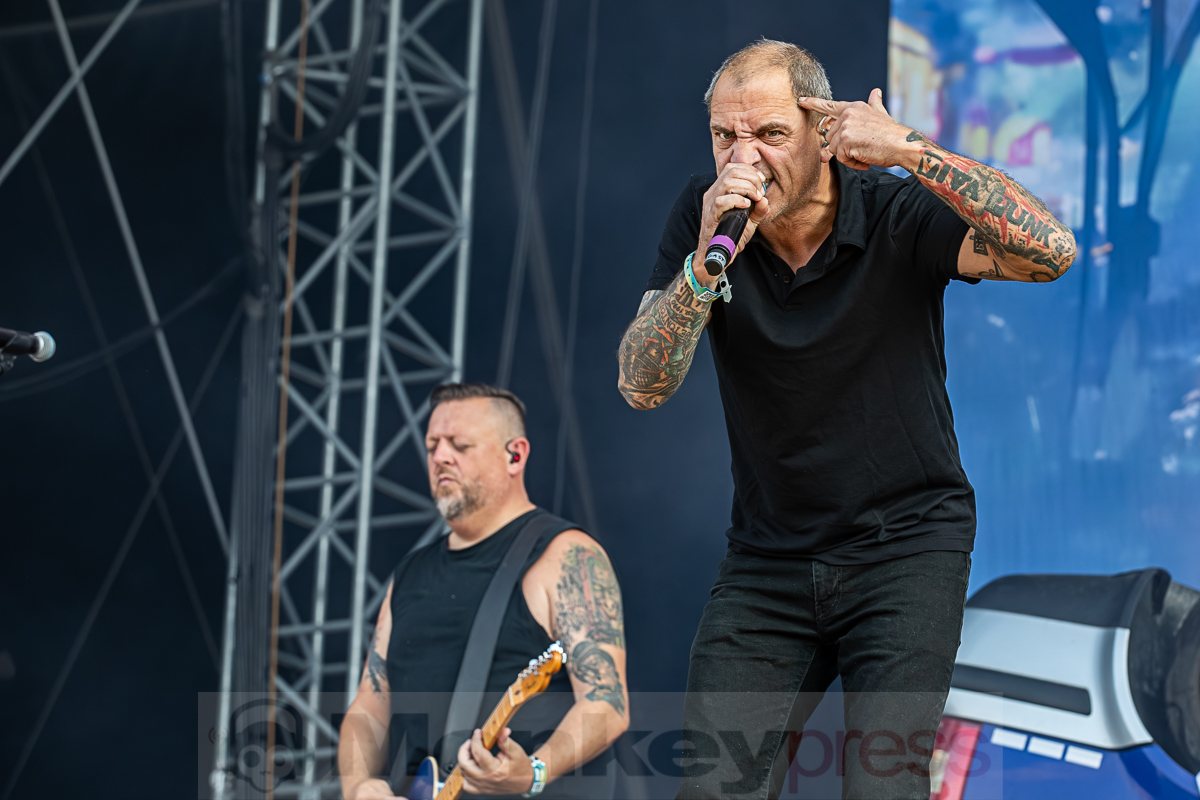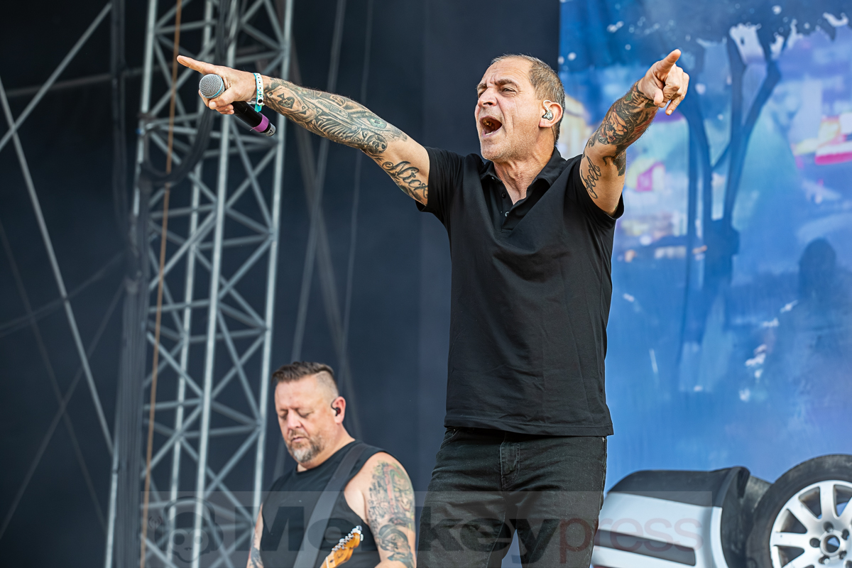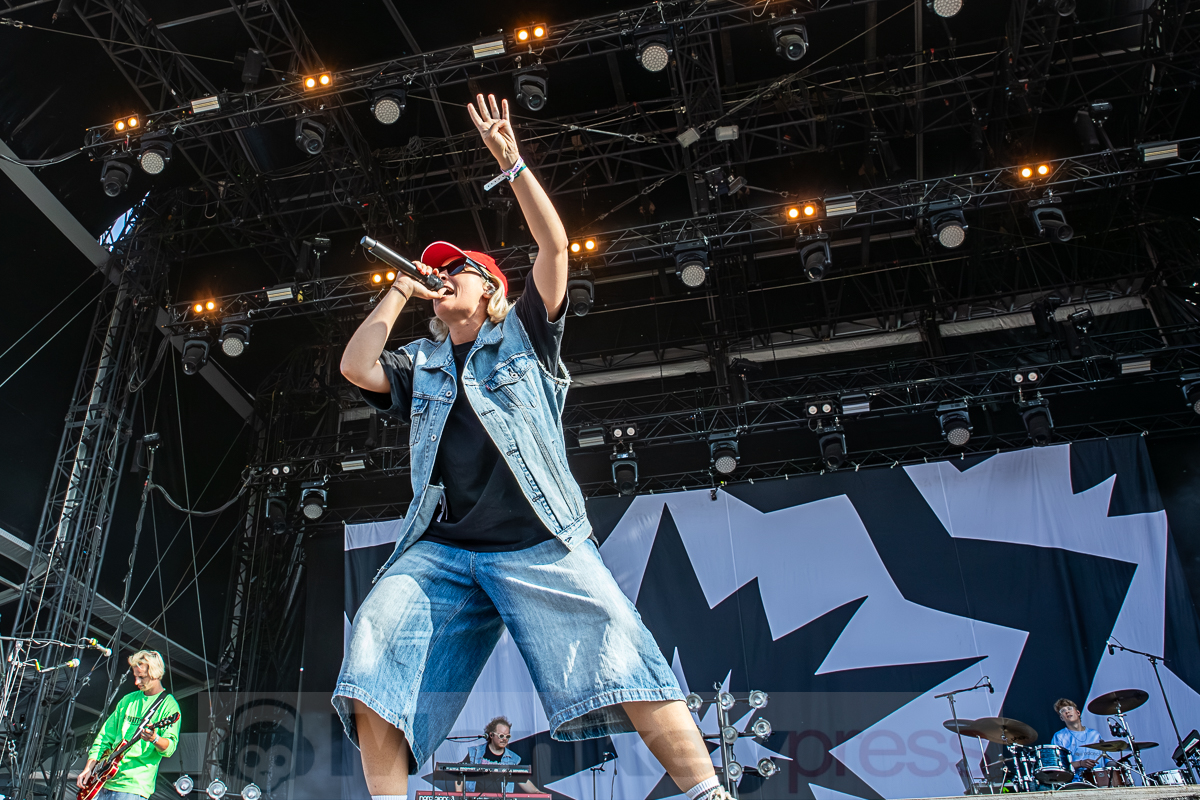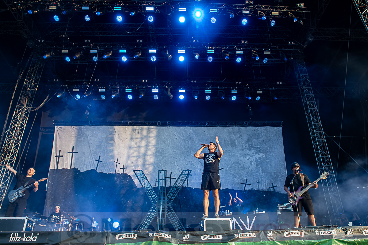 Dann ging es schließlich wieder im Programm weiter auf der Green Stage und dieses Mal waren Swiss & Die Andern diejenigen, die für Stimmung zu sorgen hatten. Über der Stage wehte die Regenbogenfahne und auf der Bühne wurde die Bandfahne geschwungen. Drummer Tobias drosch drauf los und schon wurde es wild. Direkt bildeten sich mehrere Moshpits, während Frontmann Swiss auf einem Podest lossang – „Punk ist tot“. Der Track hatte neben Punk- auch Reggae-Vibe was wiederum zum tollen Wetter an diesem Tag passte. Die Arme waren im Publikum oben und es wurde selbstverständlich auch mitgesungen. Die Band war gut drauf und forderte immer noch mehr einzelne Kreise und Pits ein und hatte damit auch Erfolg. Es war eine pure Punk- und Pogo-Fete, die für mehrere Staubwolken sorgte.