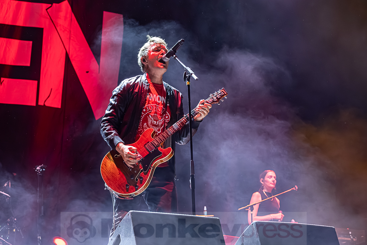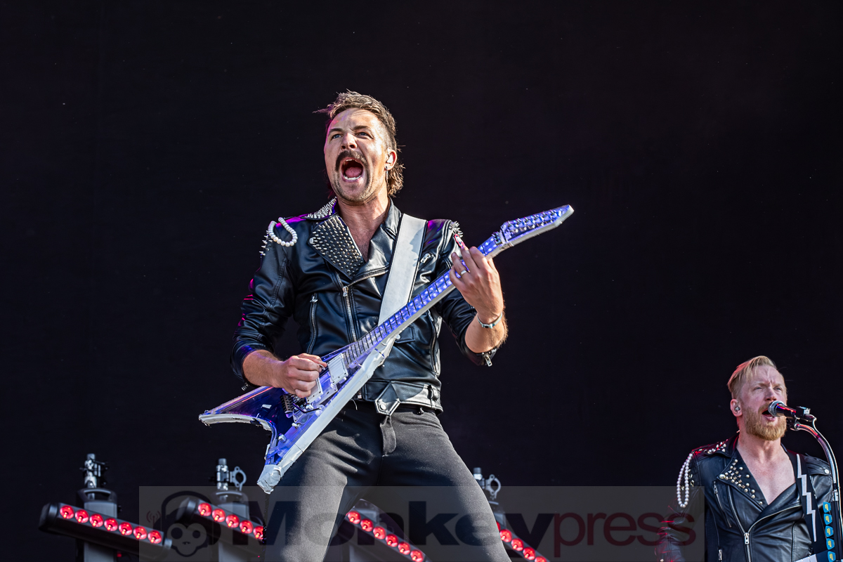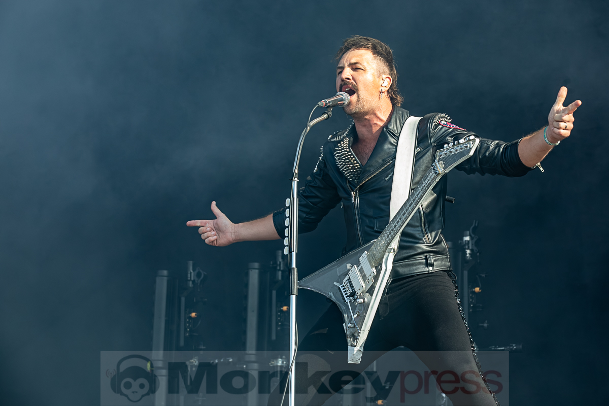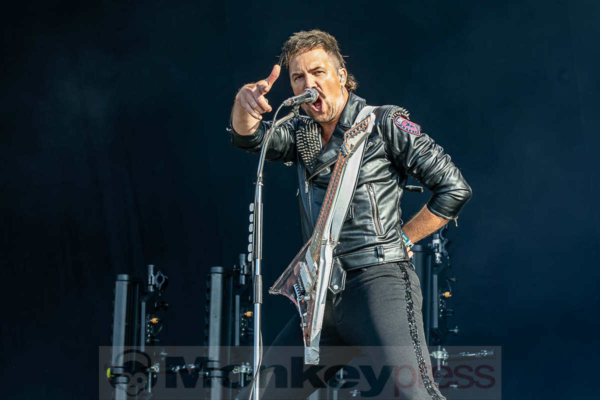 Royal Republic hatten derweil ihren Auftritt auf der Green Stage schon begonnen. Wir hörten noch die letzten Klänge von „My House“. Vor der Bühne war es echt voll und alle schienen ihren Spaß zu haben. Es wurde mitgeklatscht und getanzt. Die vier Schweden hatten allesamt eine dicke Lederjacke an – und standen in der prallen Sonne. Uns wurde schon beim zusehen extrem warm. Nichtsdestotrotz rockten die Band drauf los und gab wirklich alles. Hinter den Musikern schwebte das Bandlogo als Neonreklame und mehrere Lichterreihen bildeten dazu ein schickes Bühnenbild. Der mehrstimmige Gesang bei „LoveCop“ war ein Trommelfellschmeichler. Die Zuschauer hatten die Arme oben und klatschten im Takt mit. Es wurde getanzt und gesprungen. Frontmann Adam hatte eine leuchtende Gitarre, was ein cooler Effekt und ein echter Hingucker war – neben den Herren selbst.