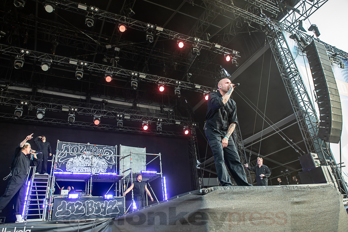 Dann war es wieder einmal Zeit für Hip Hop aus Deutschland. Die 102 Boyz aus Leer waren auf der Blue Stage an der Reihe. Die Fans warteten schon sehnlichst auf die Herren und riefen vorher bereits „1-0-2“. Dann kamen die sieben Jungs unter Jubelrufen nach vorn und sofort war Stimmung. Auf der Bühne war eine Art Gerüst zu sehen, auf das im Laufe des Gigs der ein oder andere kletterte, um von da auf die Menge vor der Bühne schauen zu können. Bei den vielen MCs blickten wir kaum durch, weil sie unaufhörlich von links nach rechts liefen und alle durcheinander. „Limp Bizkit 99“ wurde mitgebrüllt von den Zuschauern und alle sprangen im Takt auf und ab. Staub waberte dann auf die Bühne und verhüllte die Künstler kurzzeitig. „Bier“ wurde gemeinsam mit dem Publikum zelebriert. Dann setzten sich einzelne der MCs an den Bühnenrand und genossen die Atmosphäre. Auch wechselten sie sich vorn am Bühnenrand ab, so dass jeder einmal seinen intimen Moment mit dem Auditorium bekam. Es war so wild, dass sie „achtet aufeinander“ sagen mussten. Es kam aber niemand zu Schaden.