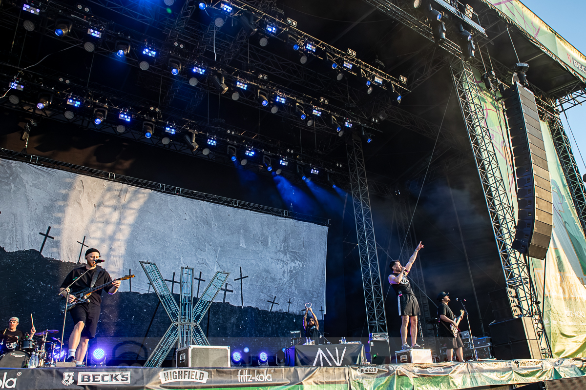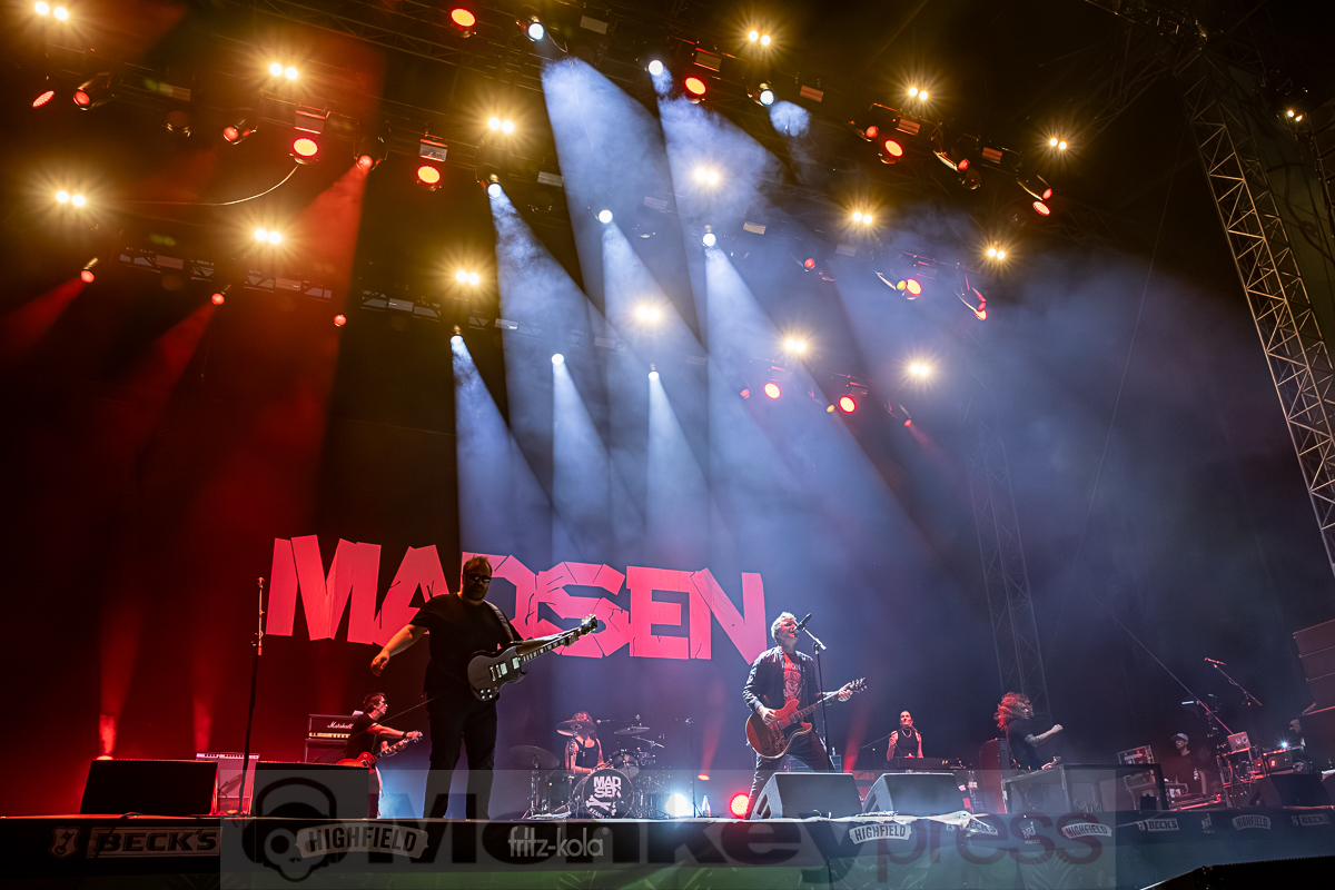 Der Staub machte uns zu schaffen und so zogen wir uns zurück. Bis es dann auf der Green Stage Zeit für Madsen war. Die Indie-Rock-Formation aus dem Wendland kam lächeln hervor und forderte direkt dazu auf, die „Patschehändchen“ zu zeigen. Vom ersten Ton an wurde fleißig mitgeklatscht. Die drei Herren Madsen und ihre Kollegen sprangen selbst im Takt auf und ab und verausgabten sich. „Guten Tag meine Damen und Herren, schön, hier zu sein.“ Warum so förmlich? „Sirenen“ erklang und die Gitarristen stellten sich dabei auf ein Podest, um auch in den letzten Reihen gesehen werden zu können. Die Menge sang laut mit, was die Musiker sichtlich freute. Die Locken von Bassist Niko wippten cool im Takt mit – das sah schon witzig aus. Nach einem Drumsolo von Sascha forderte der Sänger Johannes dazu auf „Macht euch laut“. Auch hier wieder die Aufforderung den Mund aufzumachen, wenn ein Missstand erkannt werde. Dann verriet er, dass die Band bereits zum 8. Mal beim Highfield spiele, was ziemlich cool sei.