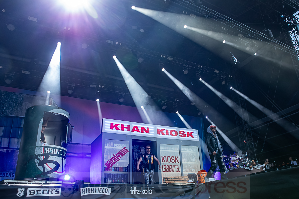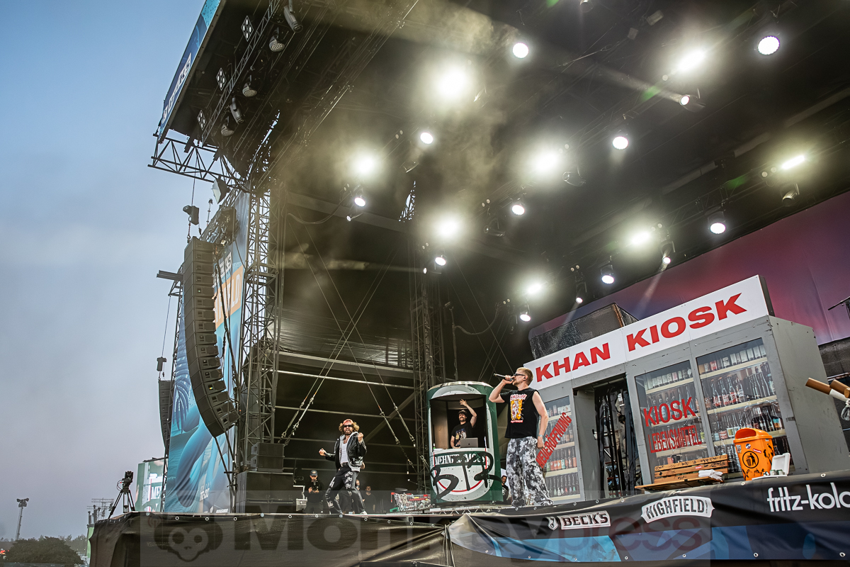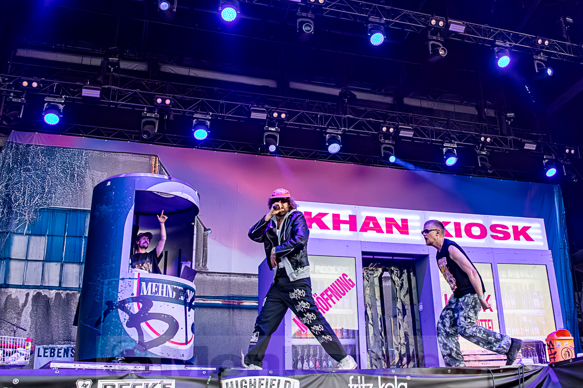 Die Blue Stage war dann Schauplatz für das Hip Hop-Duo Mehnersmoos aus Frankfurt/Main. Ein Vorhang verhüllte anfangs die Stage, doch schnell wurde dieser gelüftet und gab den Blick auf den Khan-Kiosk frei, der da stand. Daneben hatten außerdem ein Schlagzeug und ein DJ Stellung bezogen. Vor der Bühne war es voll und schnell waren die Arme oben, um Beifall zu klatschen oder im Takt mitzuwippen. Mit „Arschrapper“ ging es in die Vollen und die Fans feierten das richtig ab. Da wurde gesprungen und – ihr ahnt es – der Staub bildete wieder einmal eine Art „Dom“ über der Menge. Zum Track „Bir“ wurde von allen lauthals mitgebrüllt – „B-i-r“. Die beiden MCs MadFred und Maydn genossen den Chor – in der Hocke am vorderen Bühnenrand. Der Drummer haute währenddessen auf die Felle ein – der Beat war richtig fett. Die beiden Künstler waren unstet und blieben kaum einen Moment ruhig stehen. Bei der Musik des DJs war das auch schwer möglich. Weiter ging es mit „Rudi Völler“. Tanzkünste à la Breakdance wurden von dem Duo ebenfalls gezeigt – das war also Hip Hop in allen Formen.