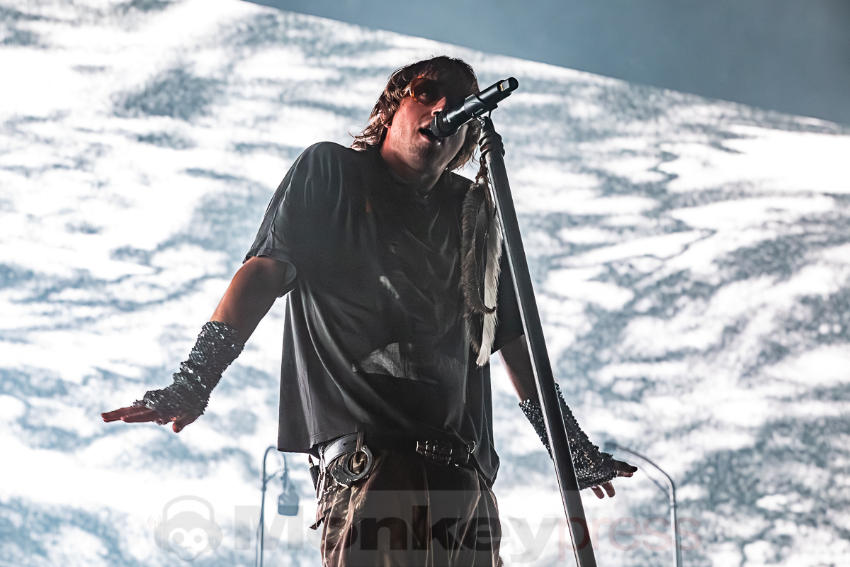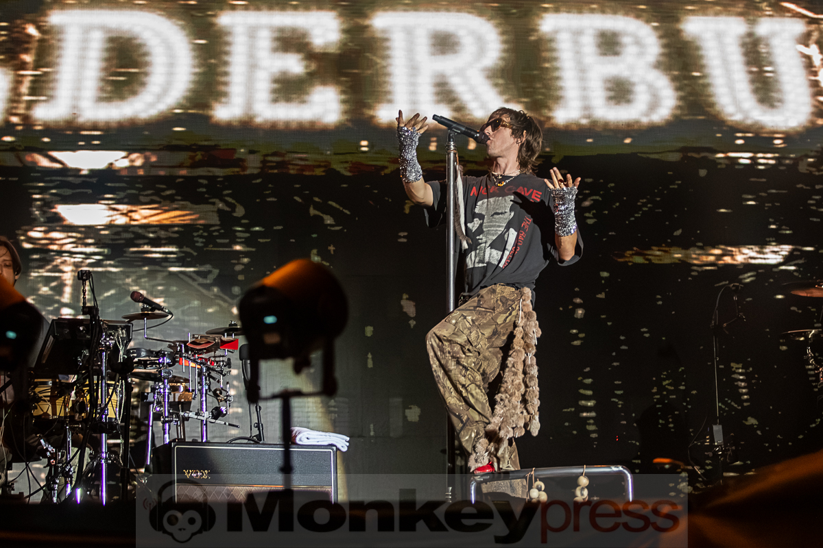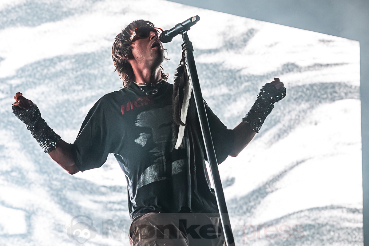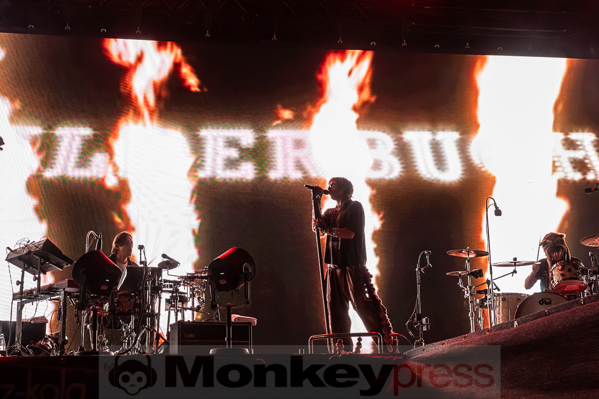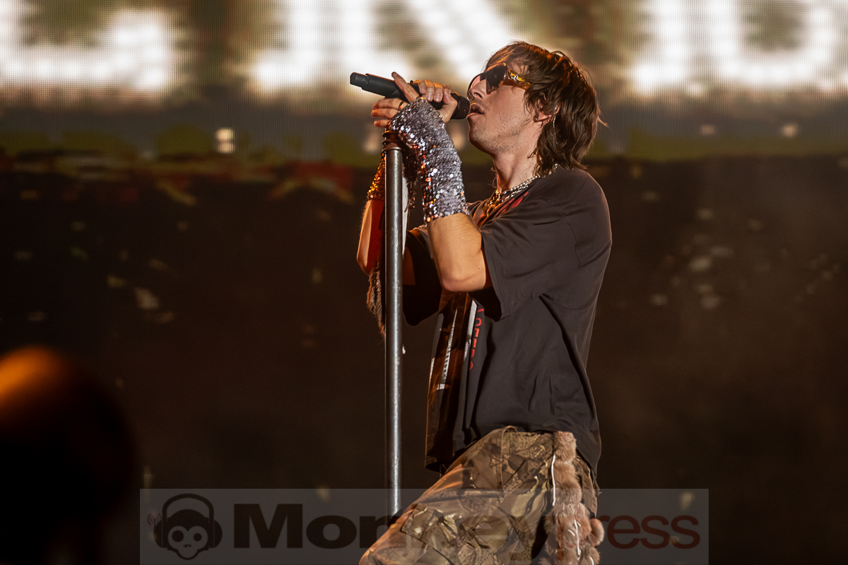 Die österreichische Formation Bilderbuch bildeten dann den Headliner auf der Blue Stage. Die Menge wartete schon ungeduldig auf die Jungs. Fünf Videoleinwände waren rund um die Band aufgebaut worden. Der Frontmann Maurice wirkte sehr extrovertiert – mit glitzernden Handschuhen und einer unnahbaren Attitüde. Gitarrist Michael stand ihm aber in nichts nach – mit Kuschelmantel und Fellmütze. Feuer schoss zu Beginn gen Himmel und dann legten die Musiker mit „Softpower“ los. Anfangs stand der Sänger im Kreise seiner Kollegen, die weiter hinten auf einem großen Podest zusammen Platz gefunden hatten. Erst später trat er auch nach vorn auf den Steg im Bühnengraben und kam so seinem Publikum näher.