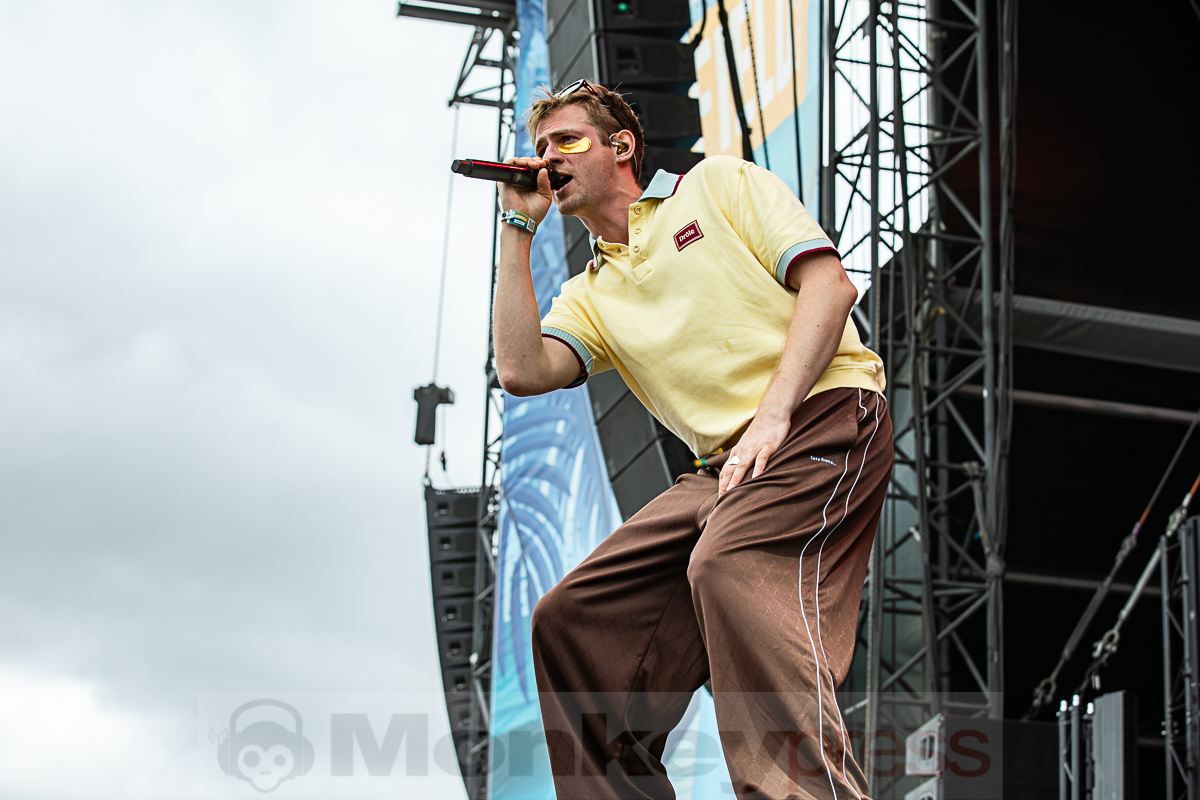 Nach diesem Spaß ging es wieder zurück zur Blue Stage. Hier waren nun Bibiza dran, seine Fans glücklich zu machen. Und diese Aufgabe erfüllte er mit Bravour. Los ging es mit „Eine Ode an Wien“, wo direkt alle Arme im Publikum oben waren – zum wippen oder klatschen. Und wer nicht klatschte, der oder die tanzte und hüpfte im Takt auf und ab. Staub zog dieses Mal gen Bühne und hüllte die Künstler ein. Der Sänger trug eine Sonnenbrille und war gut gelaunt. Seine musikalischen Kollegen gaben hinter ihm alles und taten dabei ganz cool – mit Sonnenbrille und Zigarette im Mund. Zu „Hautevolee“ gab es ein cooles Basssolo, was für extra Beifall sorgte. Danach wurde gemeinsam abgetanzt – beim passenden Track „Tanzen“. Ein Armemeer wogte außerdem hin und her und so etwas sieht jedes Mal toll aus – wie schick muss das dann für die Musiker*innen immer sein?! Diese gute, handgemachte Musik kam super an und hinterließ nur fröhliche Gesichter. Mit „Akademie der bildenden Künste“ besang Bibiza dann auch noch eine großartige Institution für die Kunst. Ja, auch die Bildungsstätten für Künstler*innen müssen einmal geehrt werden. Eine schöne Idee. Vom ersten bis zum letzten Ton war hier gute Stimmung und nicht ein Fan stand hier still – alles richtig gemacht.