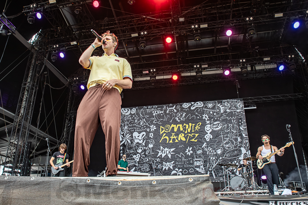 Und so ging es dann in den musikalischen Reigen des Tages. Den Anfang machte dieses Mal Dominik Hartz auf der Blue Stage. Der Musiker, der Indie-Pop macht, kam mit seiner Band nach vorn und alle hatten sie solche Schönheitspads unter den Augen. Das sah schon komisch aus und war entweder ein Teil des Outfits oder lag an der frühen Spielzeit. Die Zuschauer jedenfalls störte dieses Detail nicht und so wurde direkt mitgeschunkelt und mitgewippt. Der mehrstimmige Gesang kam gut rüber. Vom Sound her erinnerte uns das Ganze an Clueso, der ja an diesem Tag auch noch an der Reihe war. Stücke wie „Was ich will“ oder „Skinny Bitch“ regten immer mehr zum Mittanzen an und einzelne Fans sangen die Textzeilen auch mit. Dominik und seine Kollegen kamen immer wieder an den Bühnenrand vor und verbreiteten einen tollen Sommervibe – leider fehlte dazu dann, wie gesagt, die Sonne etwas. Später hatte er auch einen Track „für die Hüften“ dabei – hier war Popowackeln angesagt und der Sänger machte es sogar vor. Nach einigen Liedern nahmen die Herren ihre Augenpads schließlich ab – sie hatten ihren Dienst wohl erfüllt und so konnte dann entspannt weitergespielt und gesungen werden. Für den Einstieg in den Tag war das genau das Richtige – smooth, gefällig und mit guter Laune. Fein gemacht!