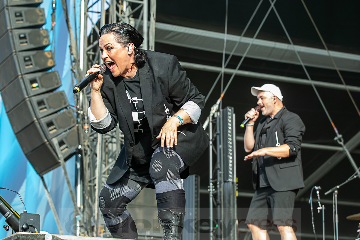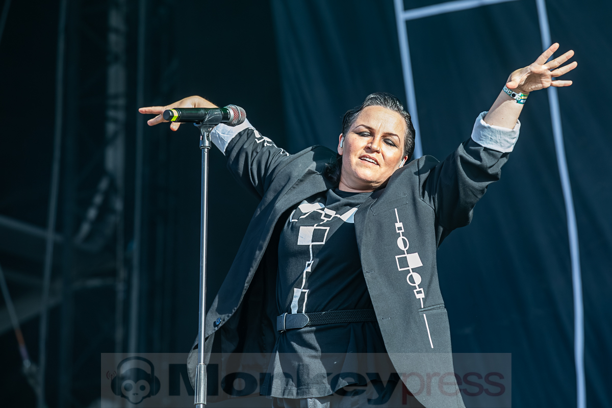 Und dann kam ein weiteres Highlight an die Reihe. Die Blue Stage war nun Schauplatz einer Institution des deutschen Elektro-Pop. Grossstadtgeflüster sind seit 2003 auf den Bühnen unterwegs und an diesem Tag wurde es wieder einmal fulminant. Jen und Raphael kamen nach vorn und wurden direkt bejubelt. Und so ging es mit „Ketchup“ auf zu einem echten Partyreigen. Es wurde herumgesprungen – vor und auf der Stage und auch Tanzen war angesagt. Vom ersten bis zum letzten Ton sangen die Fans alle Textzeilen mit absoluter Sicherheit mit – wer da nicht heiser wurde, hat irgendwas falsch gemacht. Jen war wieder einmal so gut drauf und brachte uns mit ihrem losen Mundwerk zum Lachen. „Is dit schön, euch alle wiederzusehen.“ Diese Berliner Schnauze – hach, wir lieben das einfach! Dass auch noch ihr „Sakko zur Tapete“ passte – grandios. Gemeint war hier das gleiche Muster von Anzugjacke und Leinwand im Bühnenhintergrund.