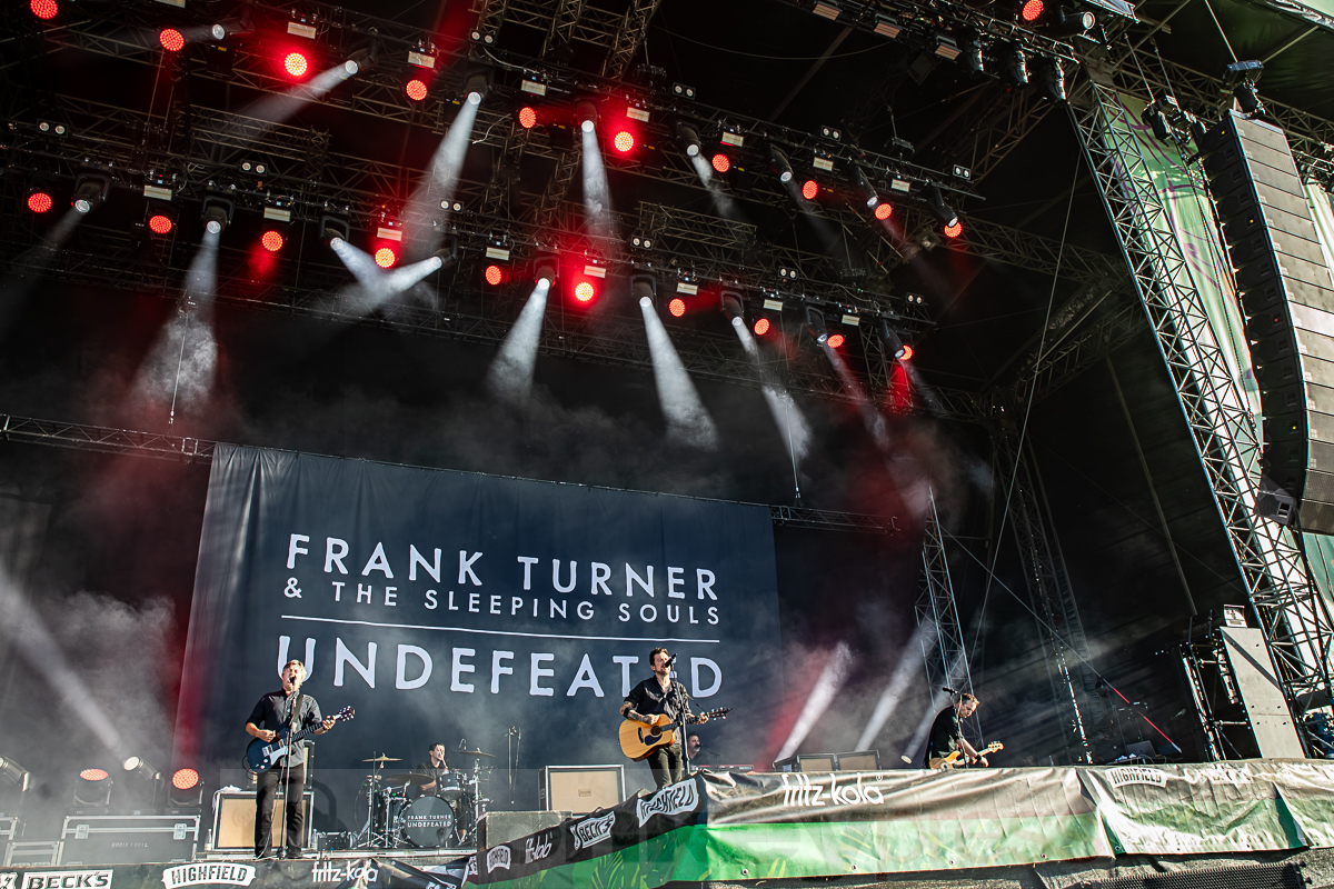 Da sich die Gigs ein wenig überschnitten hatten, kamen wir dazu, als Frank Turner & the Sleeping Souls schon mit ihrem Auftritt auf der Green Stage begonnen hatten. Der britische Musiker und seine Kollegen waren motiviert und meinten gerade: „Seid ihr bereit meine Freunde?“ Klar, die Fans waren absolut bereit. Die Sonne war mittlerweile herausgekommen und es wurde wärmer – und das nicht nur vom ausgelassenen Tanzen zu den Gitarrenklängen. Frank sang mit viel Inbrunst und manchmal schrie er seine Texte sogar heraus, wie bei „No Thank You for the music“. Es entstanden mehrere Circlepits – wilder Spaß war also angesagt. Auf und vor der Stage wurde sich verausgabt. Mal standen die Musiker zusammen und rockten miteinander und mal standen sie auf Podesten am vorderen Bühnenrand und waren so noch bis ganz weit hinten zu sehen. Mehrstimmiger Gesang, wie zu „Girl from the Record Shop“ oder „1933“, einem „antifaschist statement“, streichelte unsere Trommelfelle. Mit einem Lob an die Crew vor Ort und sein Team forderte der Sänger einen Extraapplaus ein, was auch gut klappte. Dann wurde weiter gerockt – wir zogen uns aber zurück. Nach der Party vorher mussten wir uns kurz ausruhen.