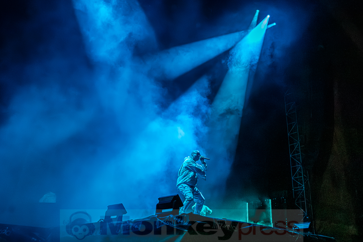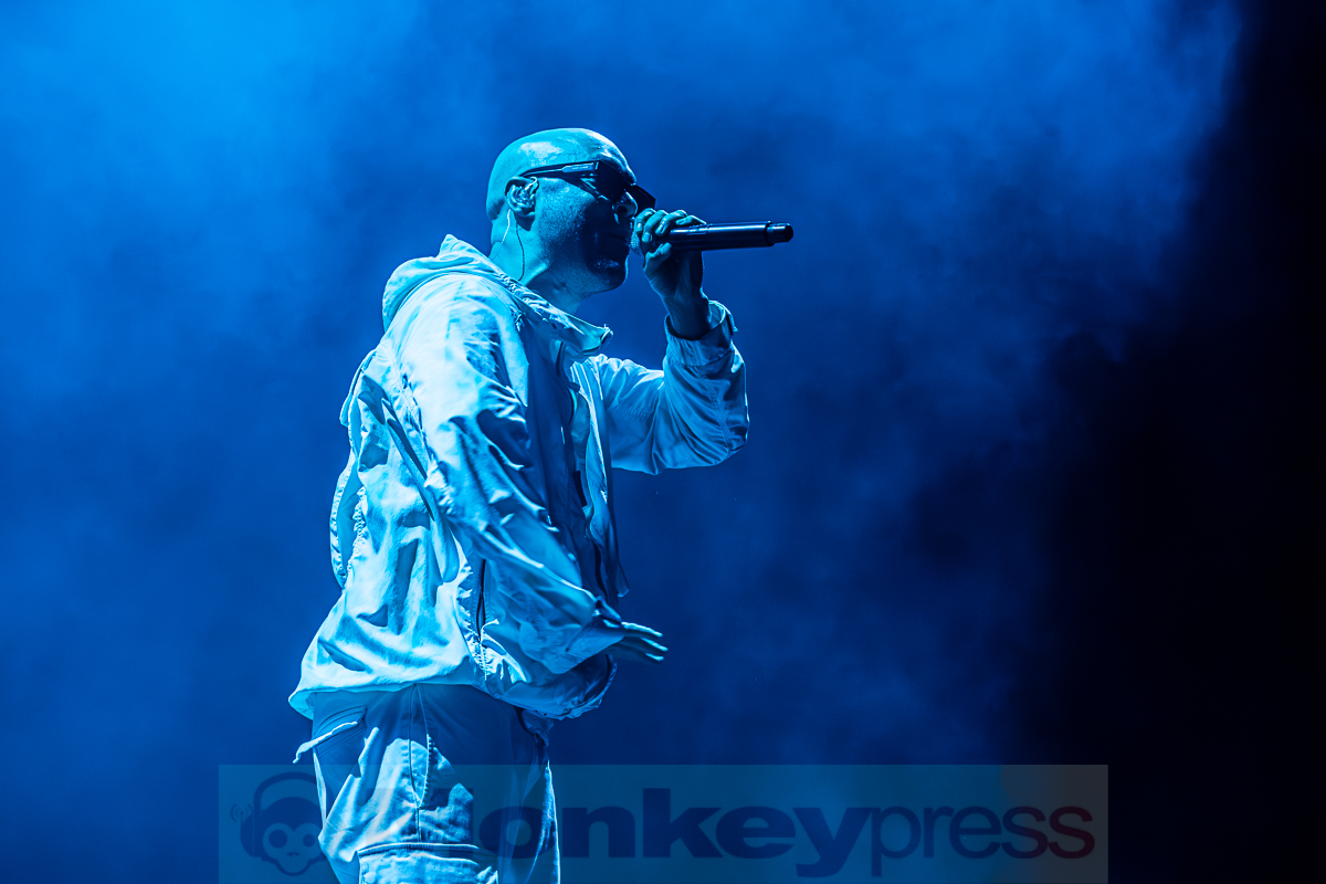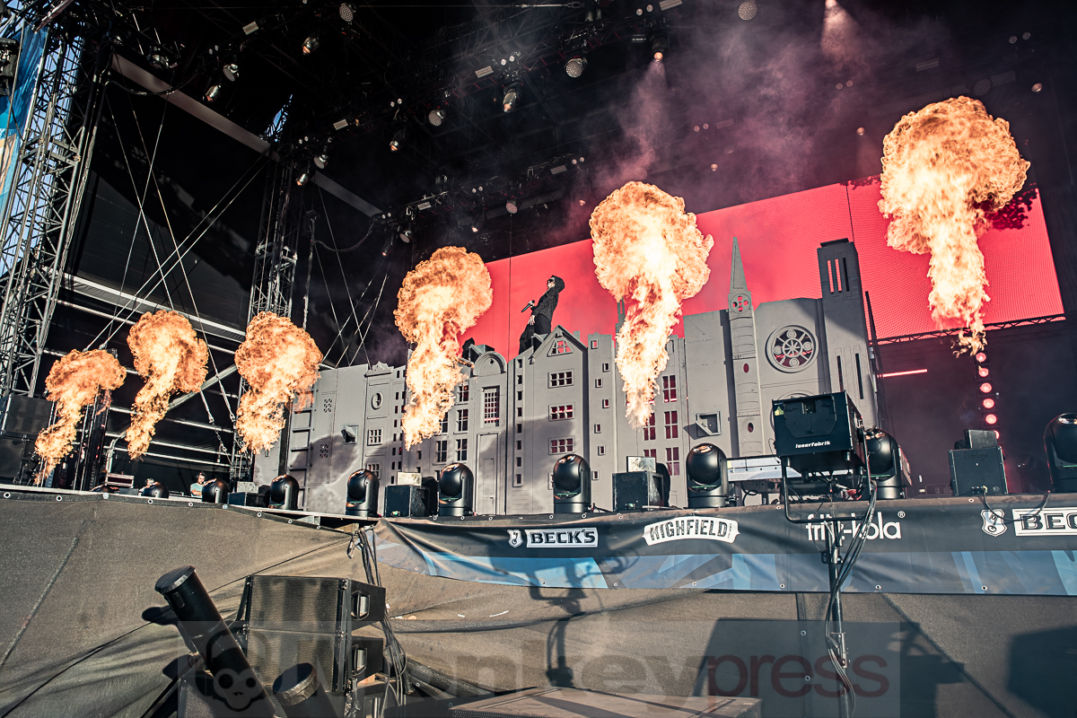 Es ging dann weiter an der Blue Stage mit Paula Hartmann. Mit der Geschichte vom Paulinchen aus dem Struwelpeter wurde der Auftritt eingeleitet und dann kam Paula in Person nach vorn. Die Berliner Sängerin hatte eine Skyline auf der Bühne, auf der sie anfangs oben drauf hin und her lief. Sie war ganz in Schwarz gekleidet, hatte eine Sonnenbrille auf und eine Kapuze auf dem Kopf. Feuer schoss am vorderen Bühnenrand nach oben. Das und die Sängerin selbst sorgten für Jubelrufe. Ein fetter Bass sorgte für Mitwippen und die Textzeilen von „7 Mädchen“ wurden vom Publikum mitgesungen. Im Text hieß es „Ich fühle mich allein“ – aber an diesem Tag war sie alles andere als allein. Es waren richtig viele Fans anwesend, die die Sängerin abfeierten.