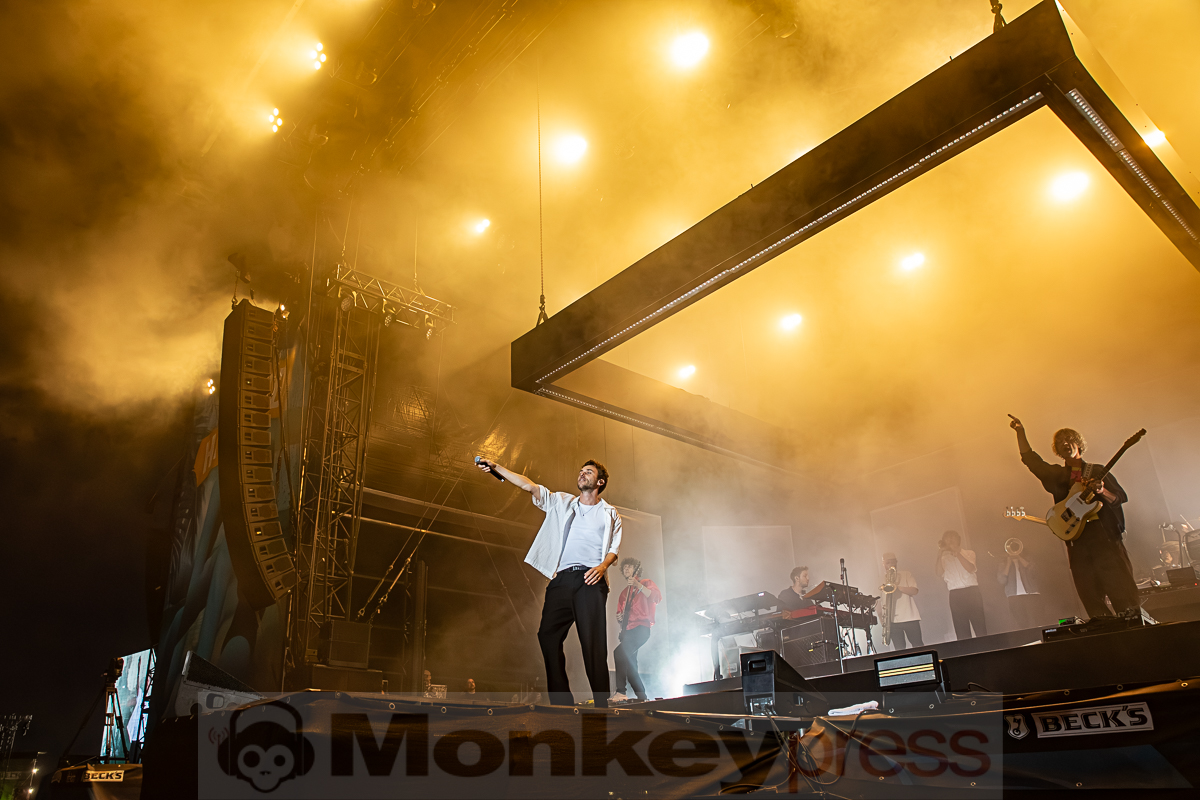 Für den Headliner an der Blue Stage war dann erst einmal die Bühne durch einen Vorhang verhüllt worden. Der fiel aber schnell und Clueso und Band kamen zum Vorschein. Über den Musikern war ein quadratischer Rahmen zu sehen, dass als Lichtgeber diente. Das war mal was Anderes und sah ziemlich cool aus. Mit einem „Zusammen“-Intro ging es dann in die Vollen. Die Liveband mit Bläsern und mehr gab alles – der Sound war absolut großartig. Die Arme im Publikum wogten wie ein Meer hin und her und der Sänger aus Erfurt war richtig gut drauf. „Neuanfang“ wurde gemeinsam zelebriert und die Fans klatschten im Takt mit. Mal stand der Sänger bei seinen Kollegen und mal war es dann am vorderen Bühnenrand, um der Crowd einzuheizen – „könnt ihr eure süßen Ärsche bewegen?“ Die Lichtshow war toll anzusehen und als später noch Laserstrahlen dazu kamen, die in den Himmel leuchteten, löste das Gesamtkonzept regelrechtes Staunen aus.