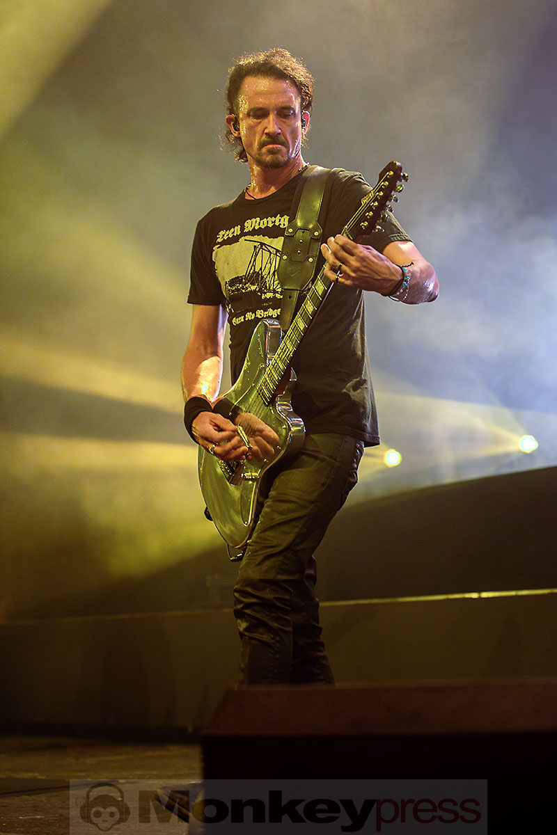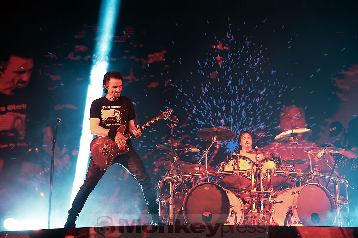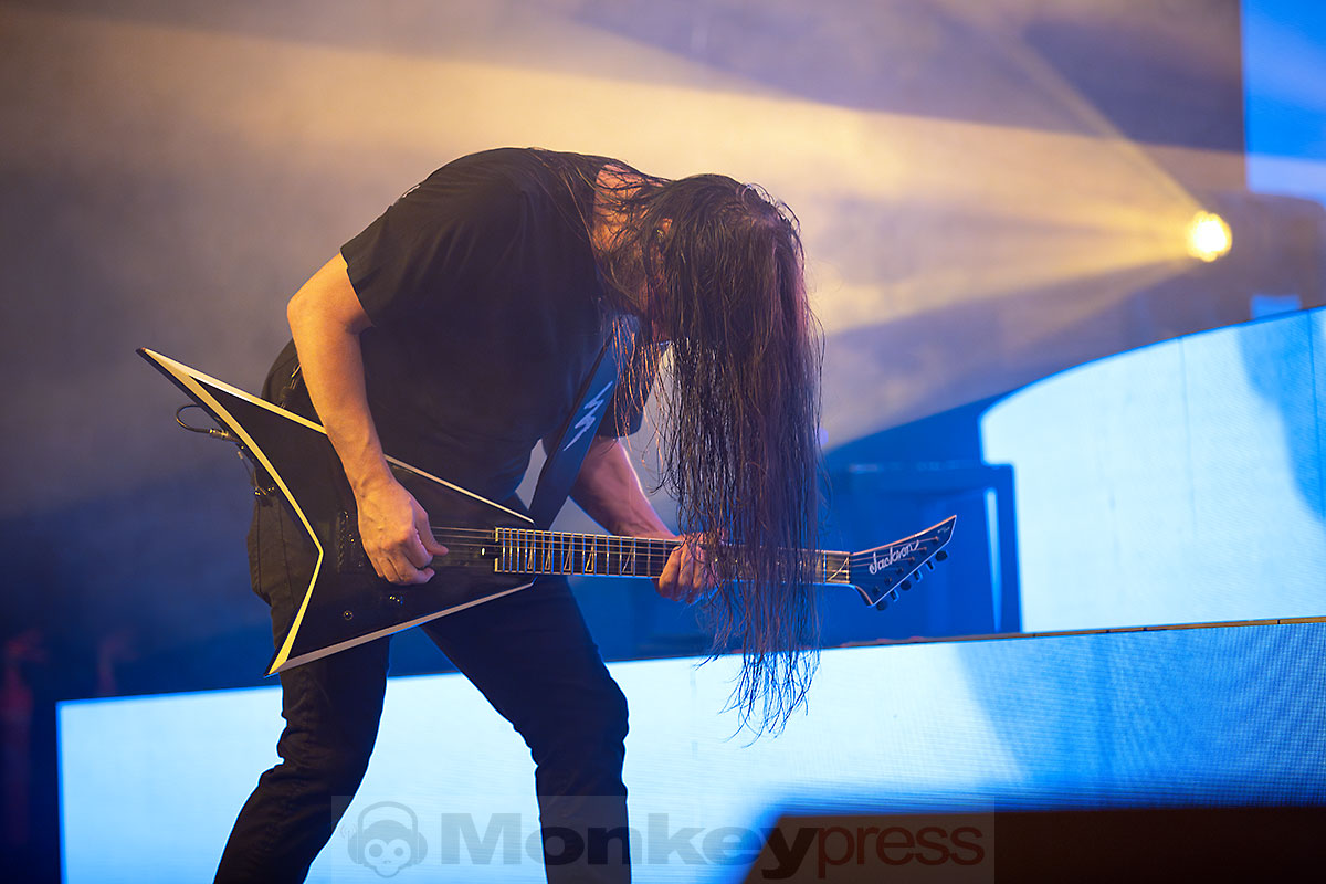 Zu „The Cell“ peitschten auf den Leinwänden Blitze durch die Dunkelheit, während auf der Bühne gnadenloses Gitarrenfeuerwerk und ein brutales Drumgewitter aufeinandertrafen. Zwischen aufsteigenden Nebelsäulen schien alles in einem kontrollierten Chaos zu versinken – ein musikalischer Sturm, der gleichzeitig präzise und völlig entfesselt wirkte. Der Sound hämmerte wie eine stählerne Lawine in die Menge, ließ Körper erzittern und Köpfe im Takt wirbeln. „We like it hot. This is a fucking experience. Are you with us?“ schrie Joe ins Mikro, und Oberhausen antwortete mit einem ohrenbetäubenden Aufschrei.