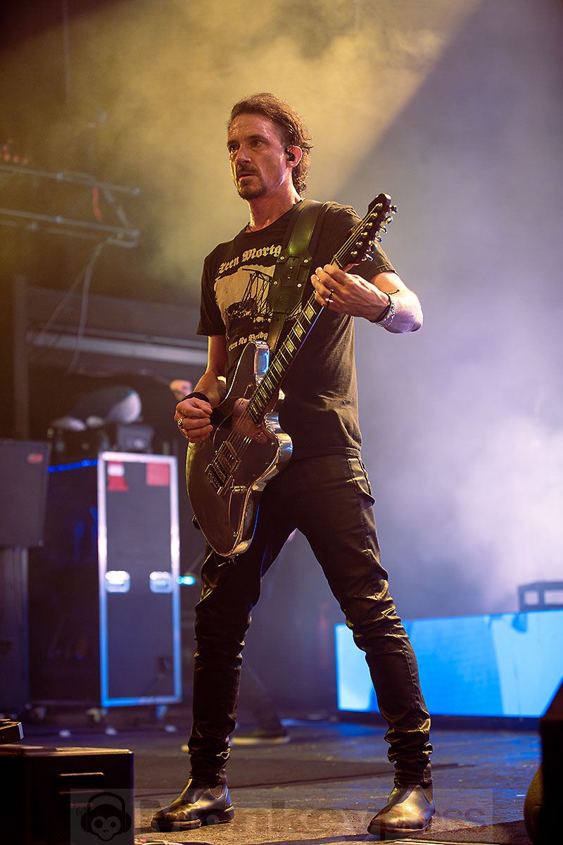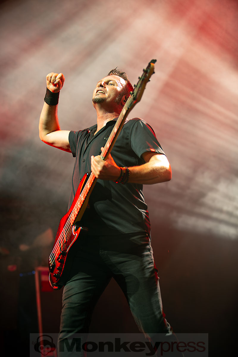 Zu „The Axe“ drückte die Masse geschlossen nach vorn, die Halle verwandelte sich in ein einziges, hüpfendes Beben. Auf der Leinwand und den Stufen erschienen Live-Bilder, die die rohe Energie noch einmal verstärkten. Der Song selbst – getragen von gnadenlos groovenden Riffs, stampfender Wucht und einem Refrain, der wie ein kollektiver Befreiungsschrei wirkte – entfaltete live eine noch größere Schwere. Wie schon bei Neckbreakker wechselten die Musiker munter ihre Positionen, während Joe sich auch gerne oben neben seinem Bruder Mario platzierte. Der Mob tobte unerbittlich und ließ sich von dieser entfesselten Dynamik vollständig mitreißen.