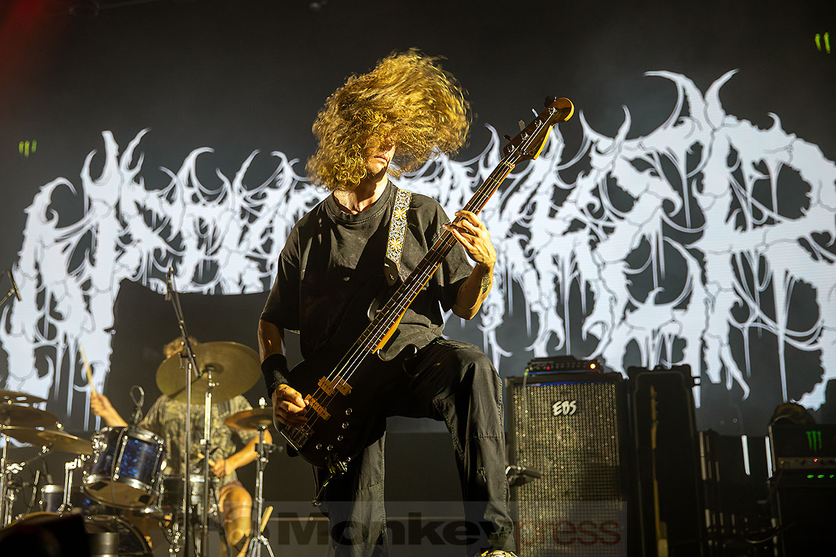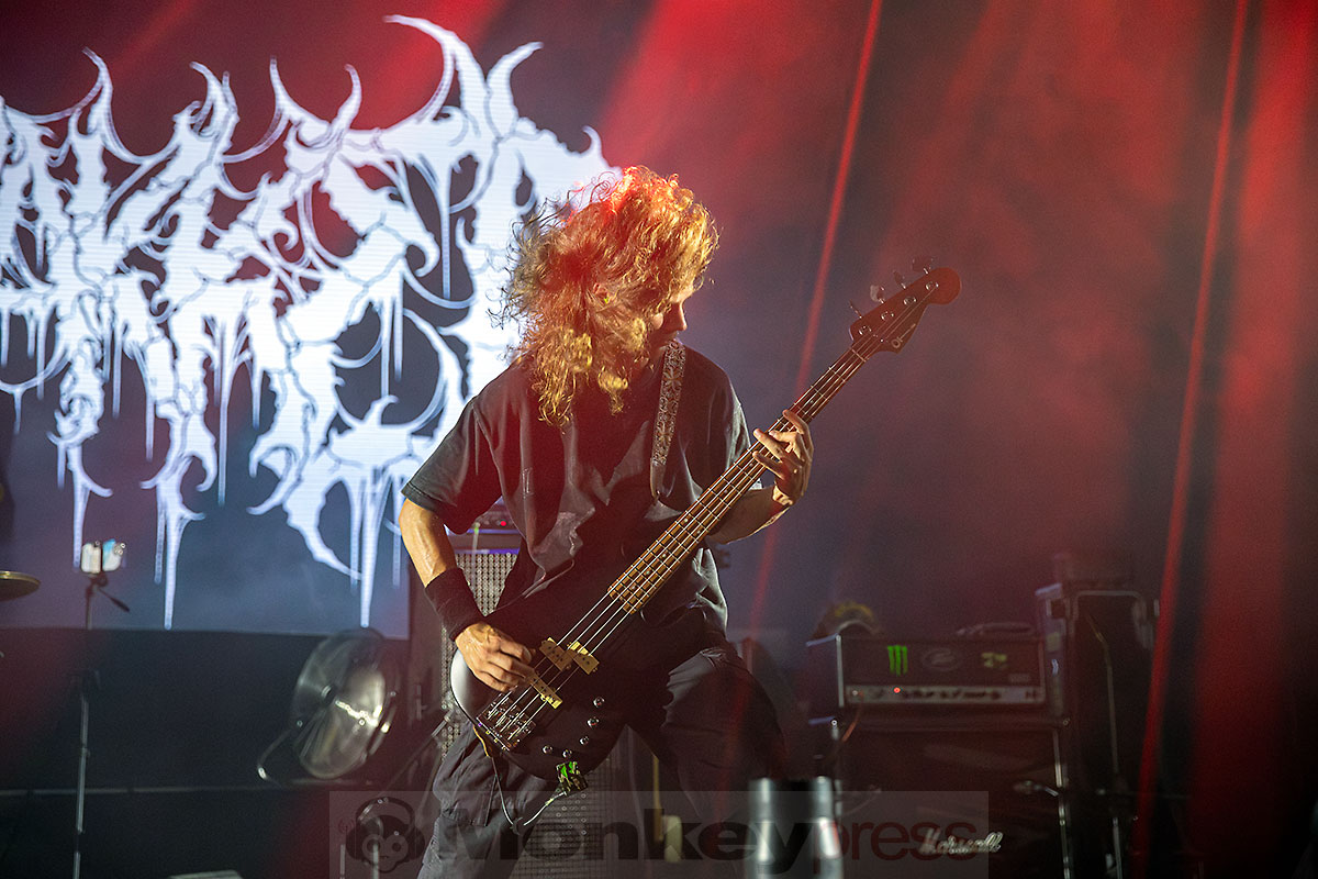 „It’s quite hot, right? Are you guys hot? Of course, you are!“ – und schon donnerte „Unholy Inquisition“ los, begleitet von der unmissverständlichen Ansage: „Split this room. Split this whole fucking room! Eins, zwei, drei, vier!“ Augenblicke später krachte die Menge im Pit aufeinander, während tonnenschwere Riffs durch die Halle rollten. Zu „Shackled To A Corpse“ hieß es dann nur noch: „Get off here, move your fucking heads!“ – pure Nackenmuskulaturarbeit für die gesamte Turbinenhalle.