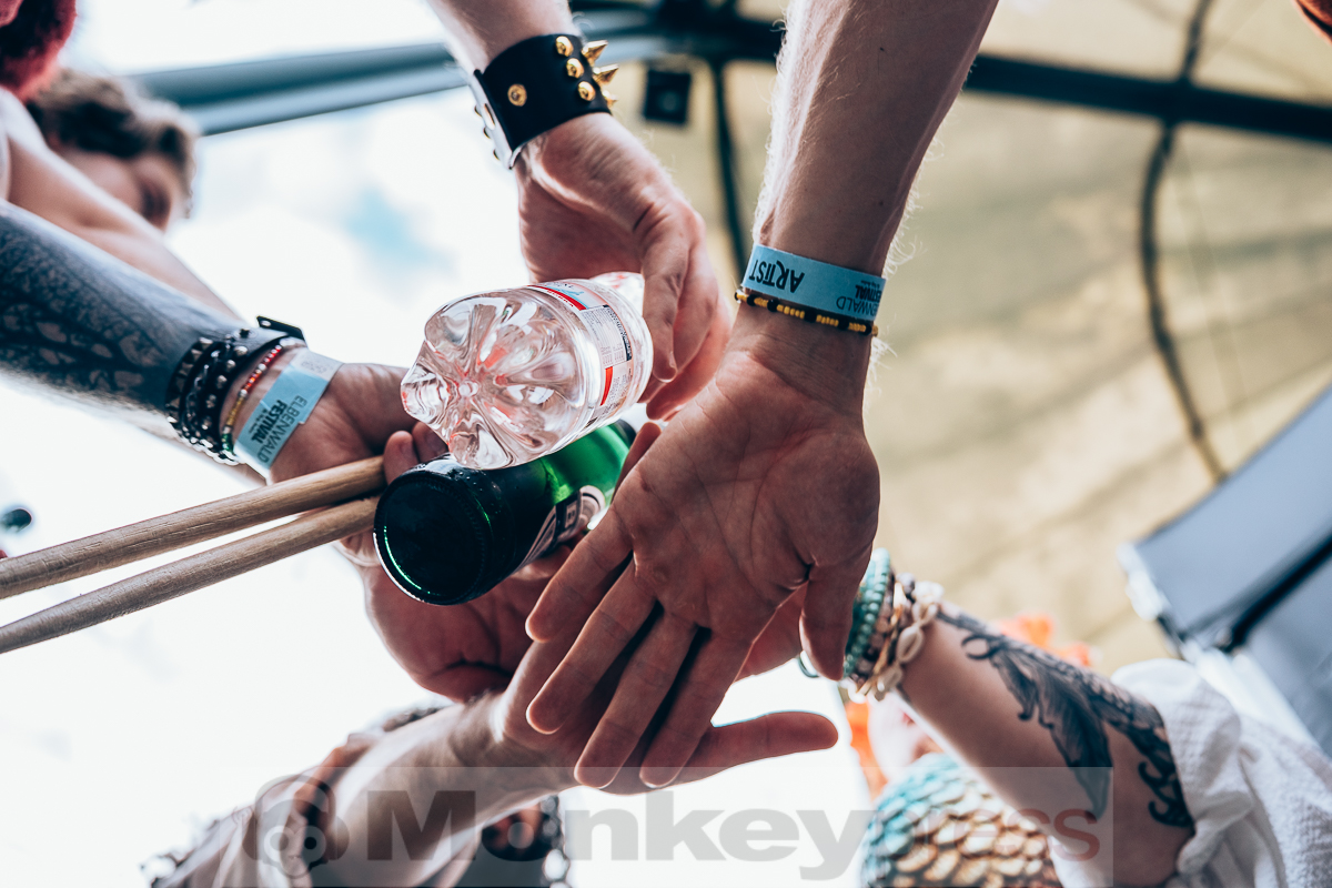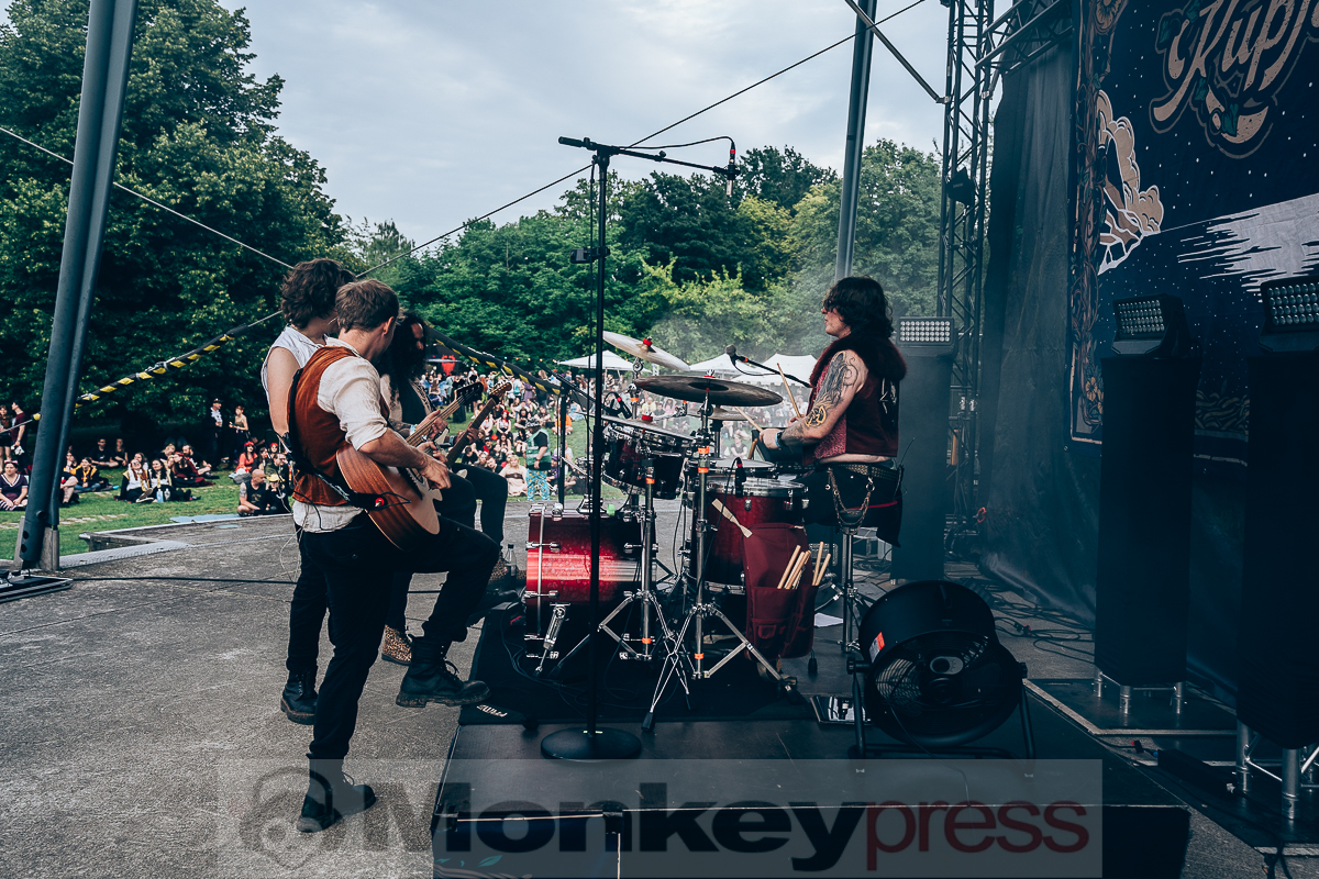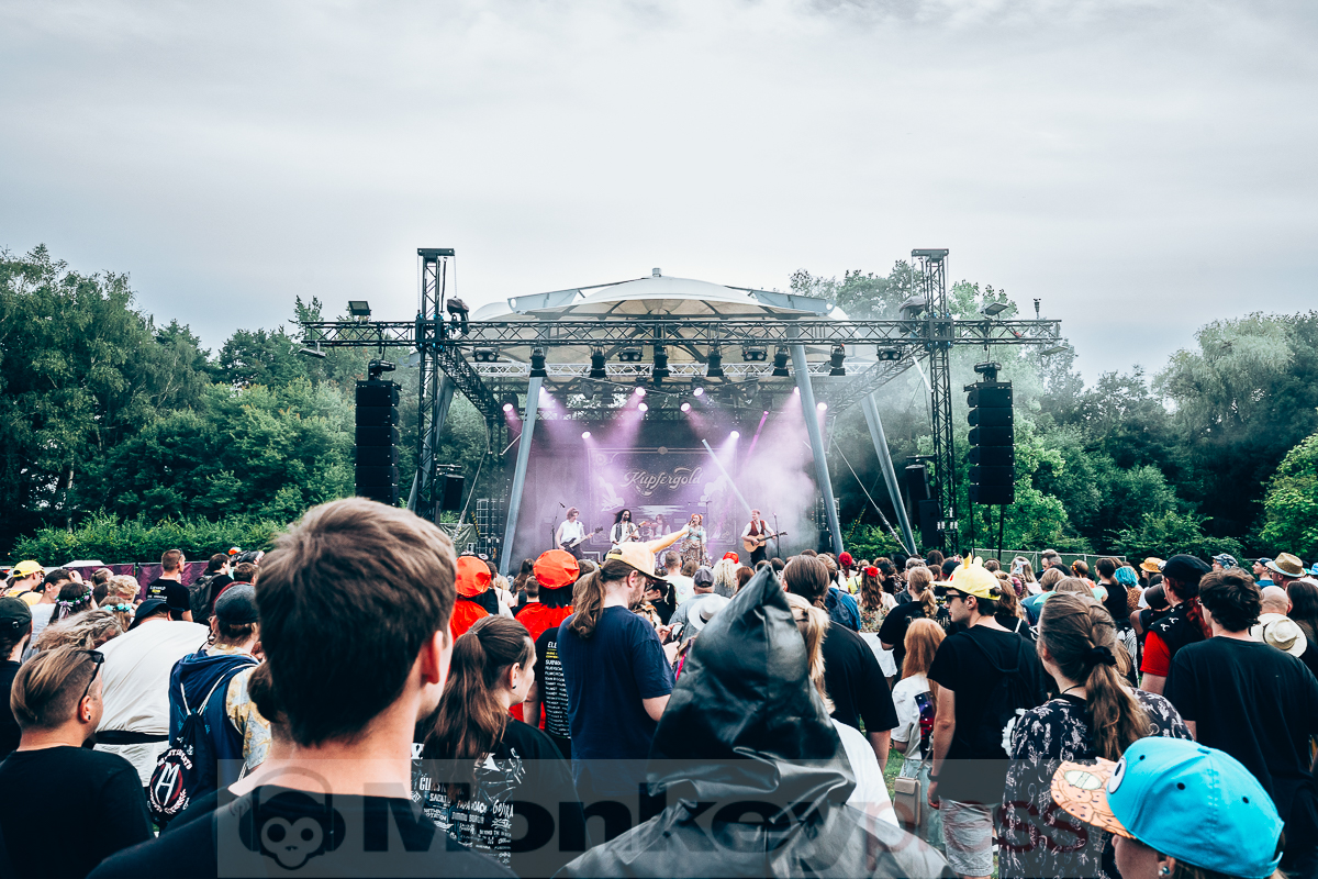 Kurz nach 14:00 Uhr trifft die Band gut gelaunt auf dem Festivalgelände ein. Nach einer kurzen Verschnaufpause geht es an die Vorbereitungen für das anstehende Meet and Greet mit den Fans und das Konzert am Abend. Während die wundervolle Bonnie Banks sich zurückzieht um in ihr Bühnenoutfit zu schlüpfen, laden die restlichesn Kupfis das Instrumenten-Gepäck aus und auch der Merch-Stand wird bestückt.