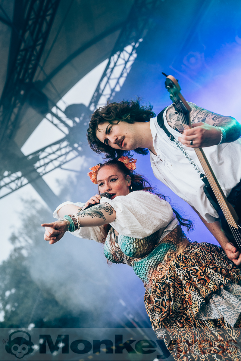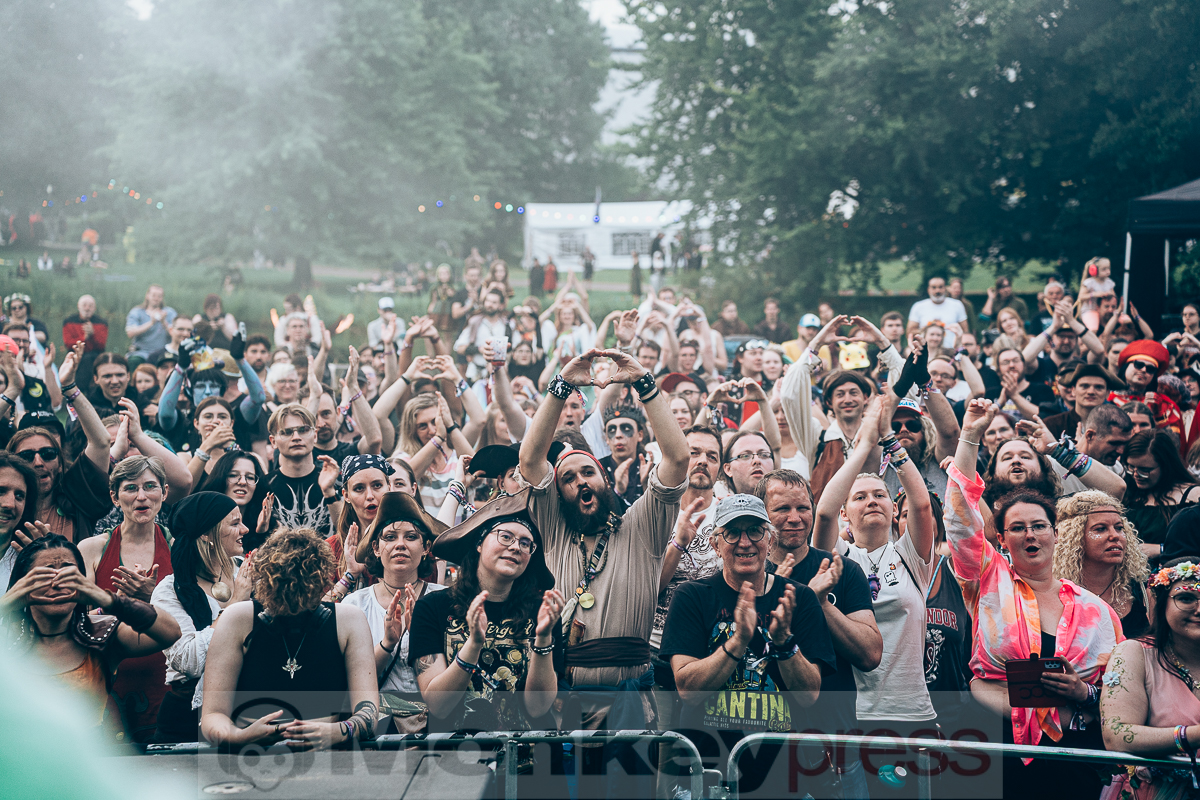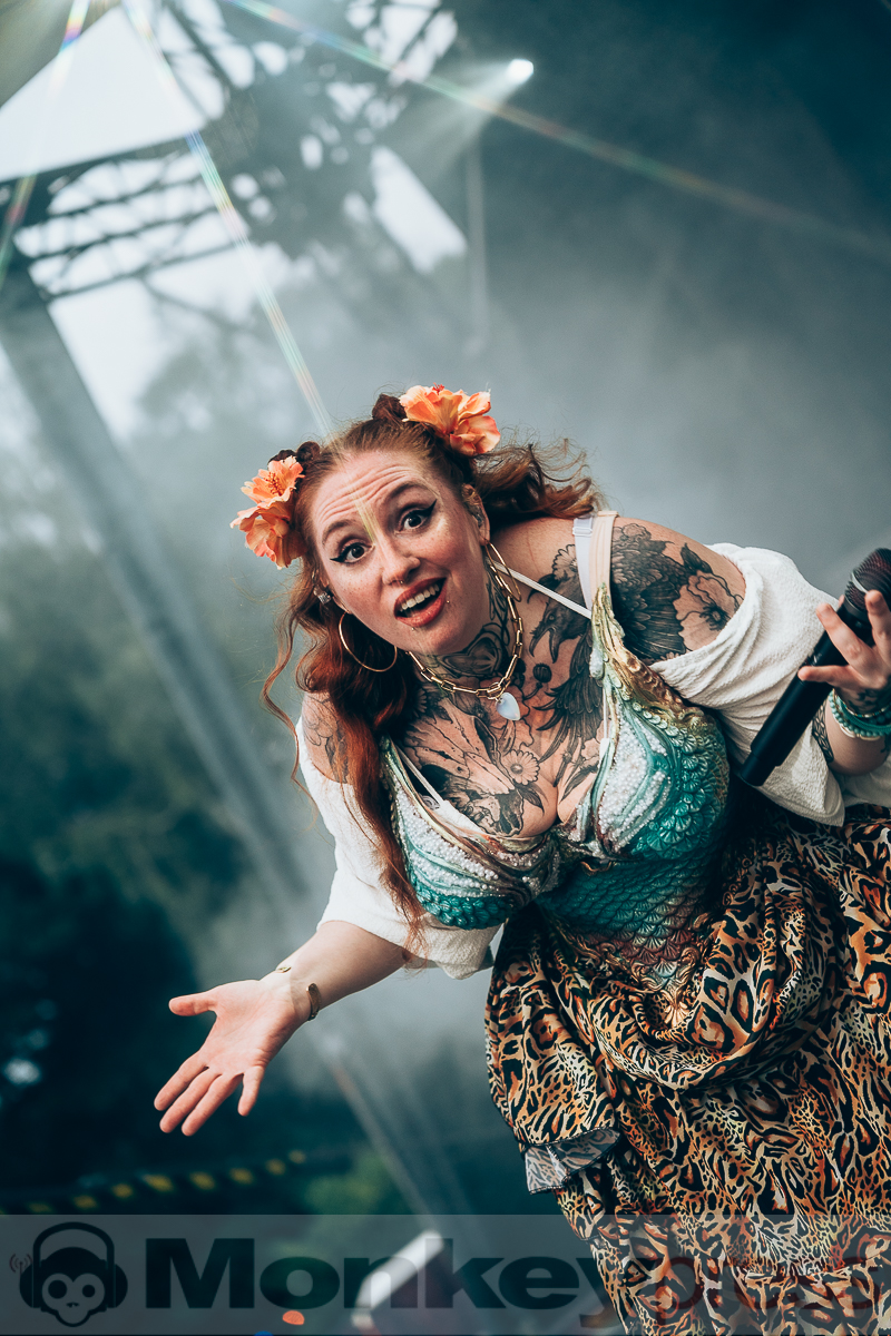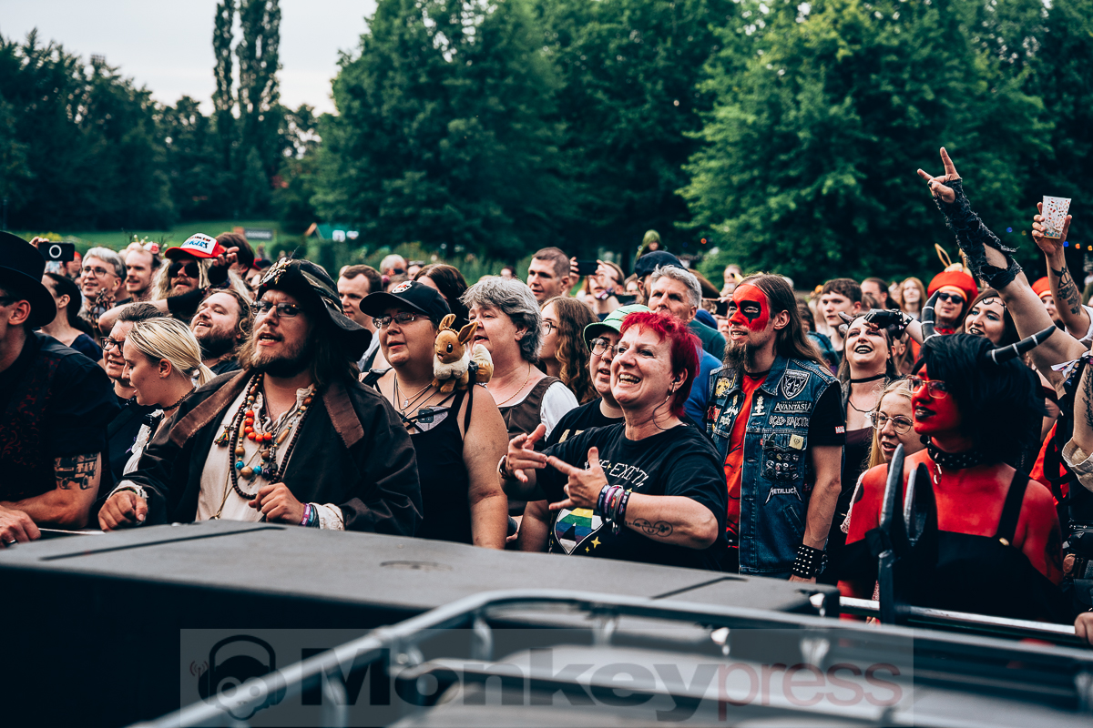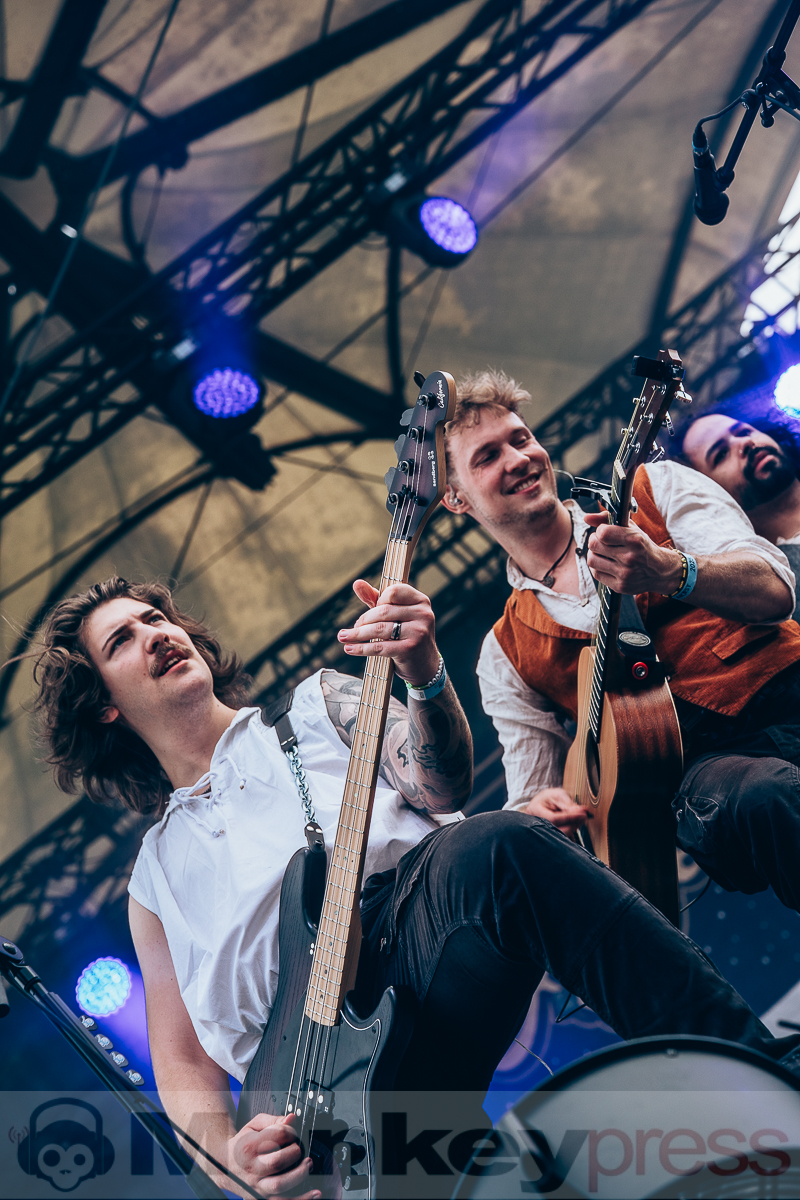 Mit „Der Metmeister“ bleibt die Band noch auf ihrem aktuellen Album, lädt die Fans danach mit „Zum Goldenen Rammler“ dann zu ihrem 2021er Album „Heiliger Bimbatz“ ein, um dann wieder zum aktuellen Album zurückzukehren: „Muschelbusen“ und „Der Klügere Kippt Nach“. Die Fans sind textsicher und singen die Songs ausgelassen im Chor mit. Mit „Lichtermeer“ und „Das Bienenhaus“ endet vorerst die musikalische Darbietung. Vorerst! Denn so einfach lässt das Publikum die Band nicht gehen. „Zugabe! Zugabe!“ schallt es der Band entgegen und die legt mit „Kupfer und Gold“, „Koboldkeile“ und „Es ist Obst im Haus“ nach.