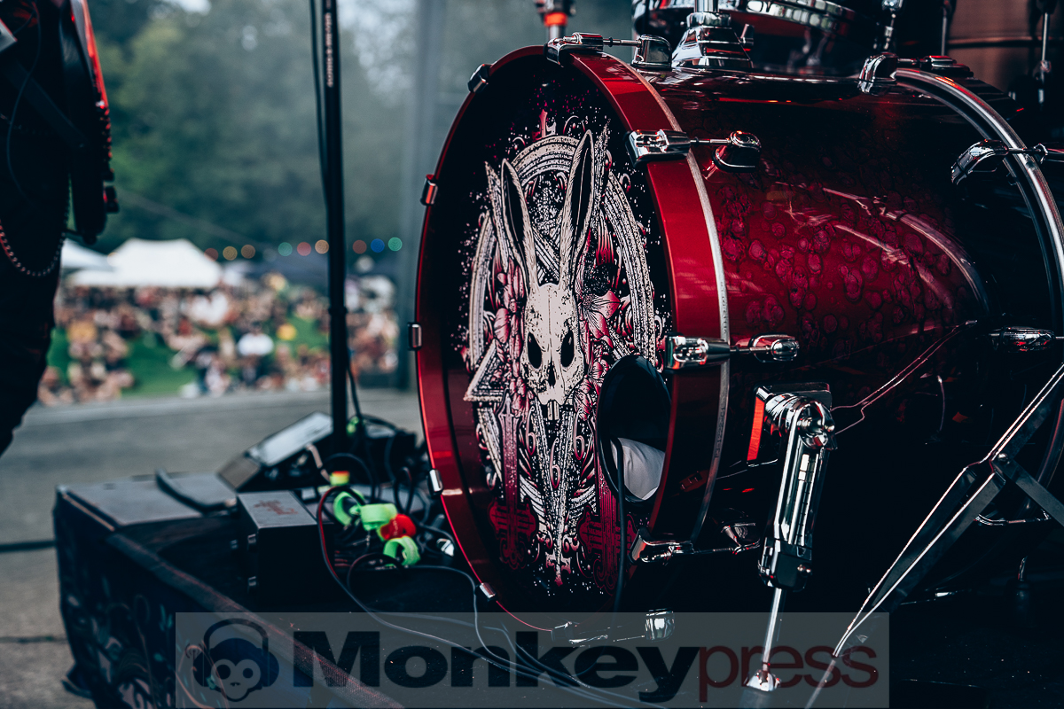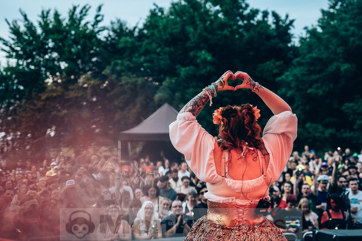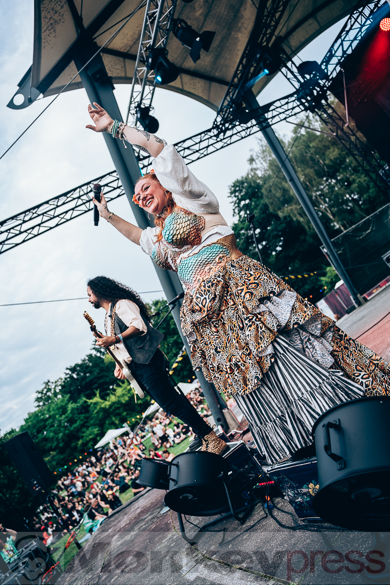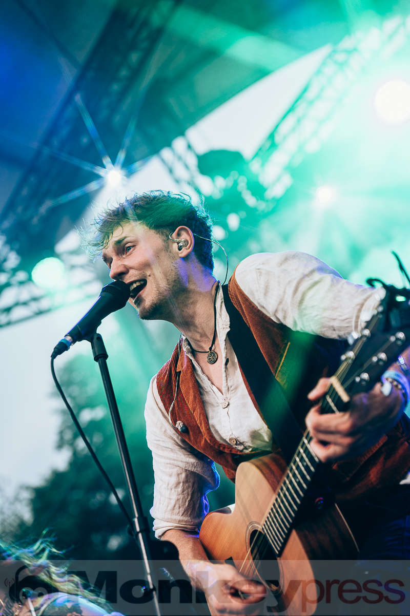 Idyllisch, mitten im Park gelegen und angrenzend an einen kleinen Teich wartet dann die Bühne auf die Band mit ihrem „Lichtermeer so shiny“. Die Aufbauten für das Konzert und der Soundcheck sind straff geplant und die ersten Fans stehen bereits jetzt an der Bühne. Jeder Handgriff sitzt und die Herzblutmusiker starten pünktlich in romantischem Sommersonnenuntergangslicht ihre Show. Mit dem Song „Grüner Drache“ vom Album „Lichtermeer“ stimmt die Band ihre Fans auf den Abend ein und stellt mit „Fasan Alarm“ das namensgebende Stück ihres neuen Albums vor.