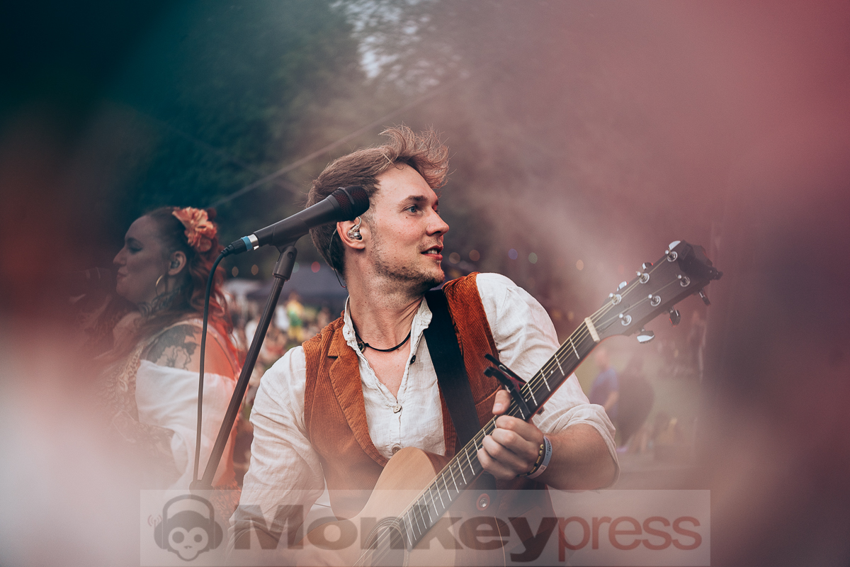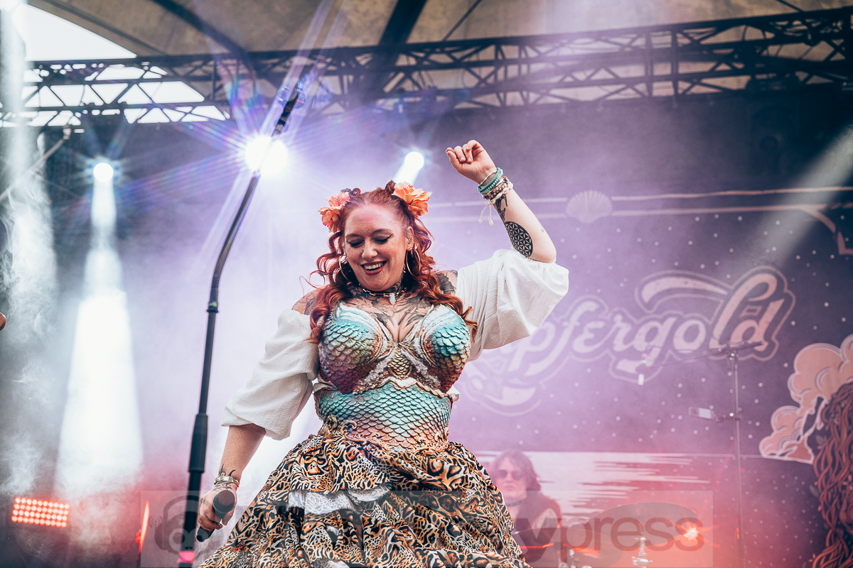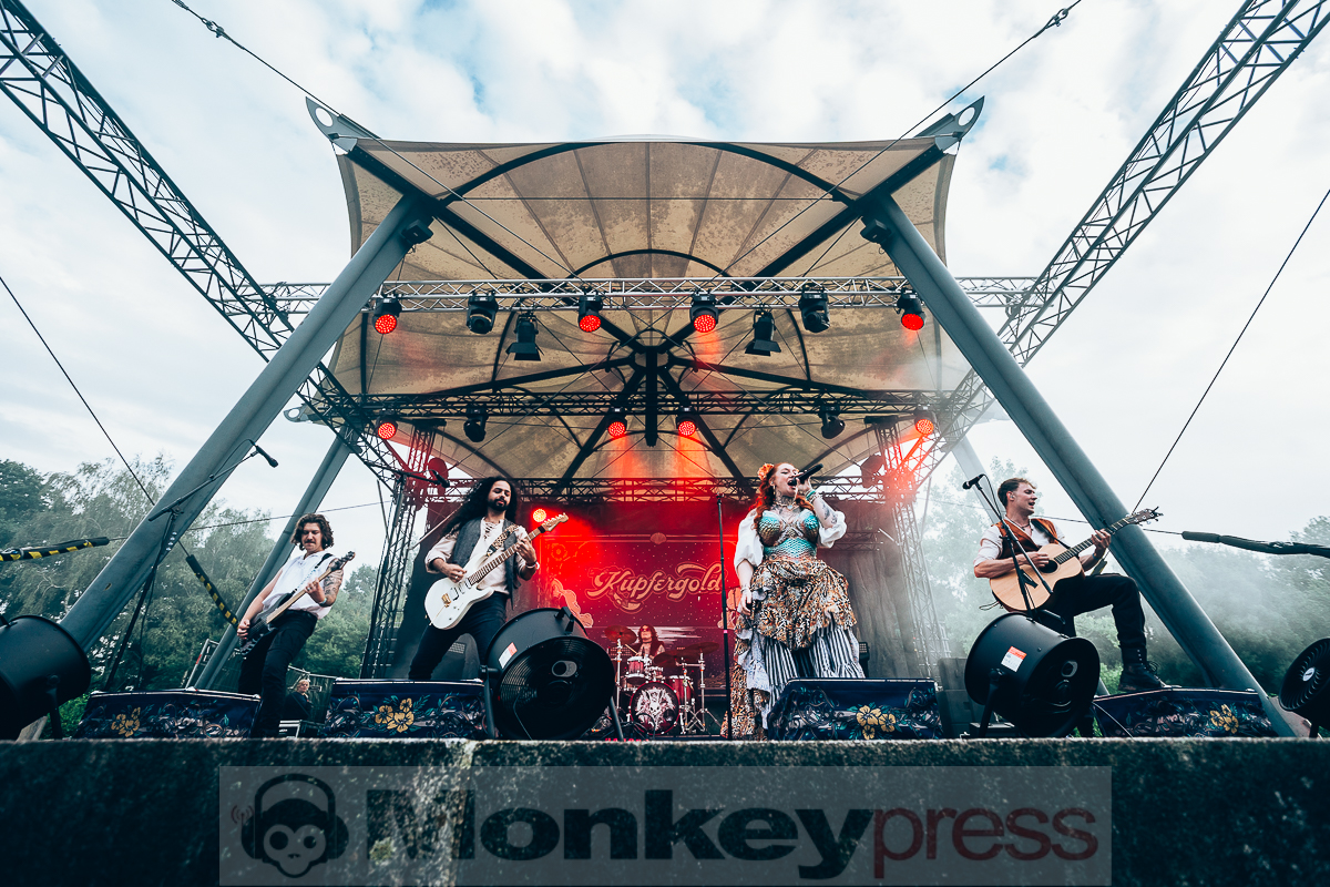 Die fünf sympathischen Rheinländer Bonnie Banks, Eric Rhymes, Bummbummbasti, Kai der Hai und Flint Stone liefern mit ihrer Band eine musikalische Mischung aus Folk und Rock ab, die ihr Publikum förmlich mitreißt und zum fröhlichen und lautstarken Mitsingen animiert: herrlich tanzbar, herrlich singbar und herrlich rotzfrech! Eine Band, die ebenfalls ein Unikat ist und gerade dabei ist, die Musikwelt im Sturm zu erobern. Als Newcomer werden sie oft vorgestellt und doch machen Bonnie und Eric bereits seit 2010 regelmäßig zusammen Musik. Die Band Kupfergold wurde dann offiziell im Jahr 2018 von Bonnie Banks, Eric Rhymes und Bummbummbasti als Mittelalter- und Folkband gegründet. Sie spielte sich mit ihren erfrischenden Songs und regelmäßigen Auftritten auf Mittelaltermärkten direkt in die Herzen ihrer Fans. Vor zwei Jahren wurde dann Kai der Hai am Bass Teil der Band und im Frühling 2025 gab die Band auf Instagram bekannt, dass Flint Stone an der E-Gitarre die Band ab sofort begleiten wird. Gesucht und gefunden haben sie sich, das merkt man der Band in jeder Minute an. Sie sind herzlich, humorvoll und herrlich entspannt und authentisch. Es ist eine wahre Freude, Kupfergold kennenzulernen, ihnen zuzuhören, ihnen zuzusehen und mit ihnen zu singen.