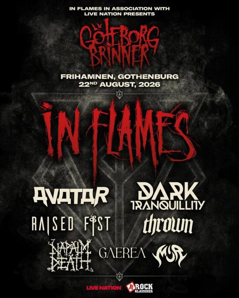 Den Abschluss bildet ein besonderes Highlight: „Göteborg Brinner“, das eigene, von der Band kuratierte Festival in ihrer Heimatstadt Göteborg. In Flames selbst werden dort als Headliner auftreten, flankiert von einem namhaften Line-up mit Bands wie Avatar, Dark Tranquillity, Raised Fist, Napalm Death, Thrown, Gaerea und Múr.