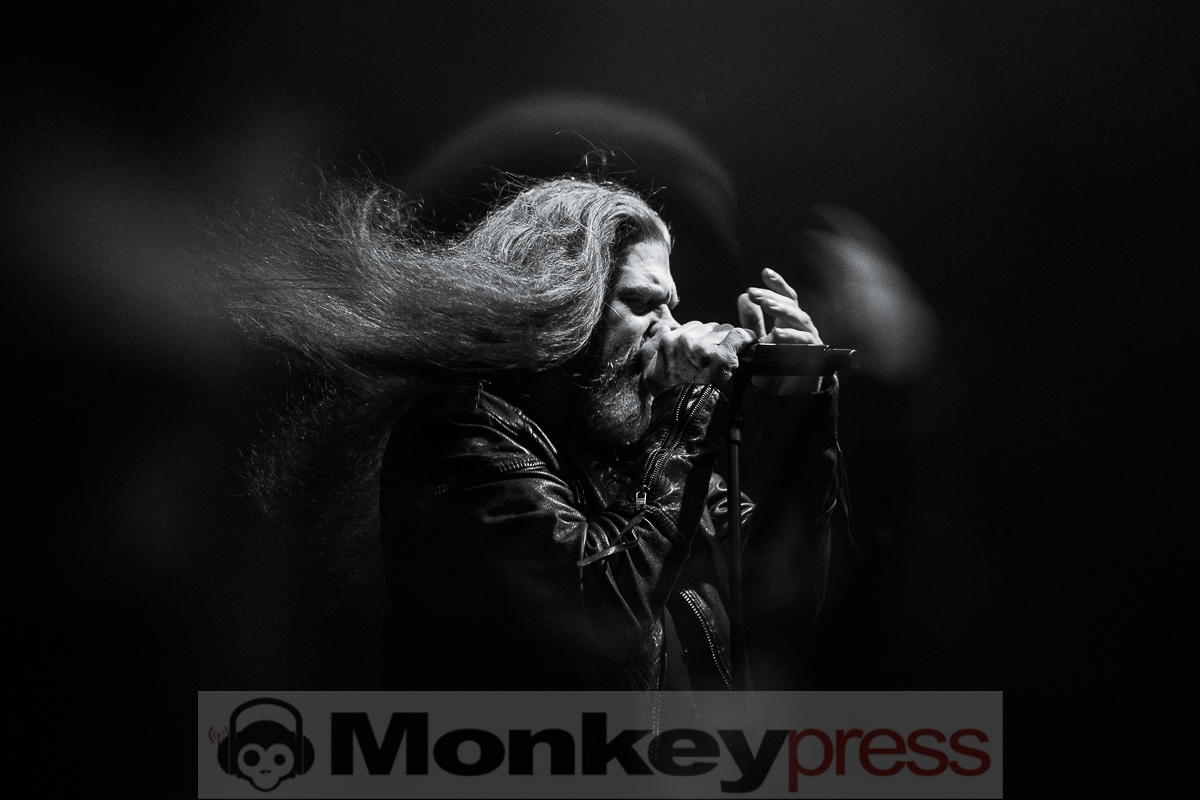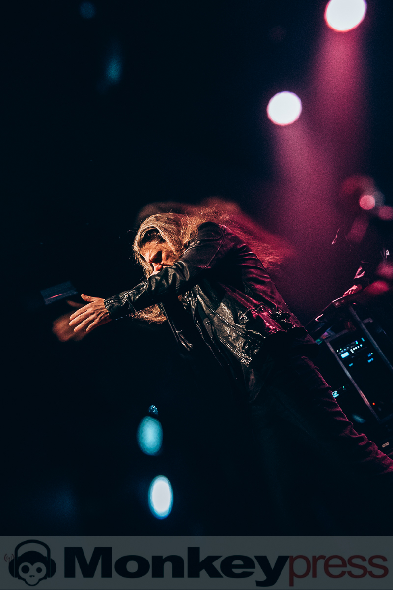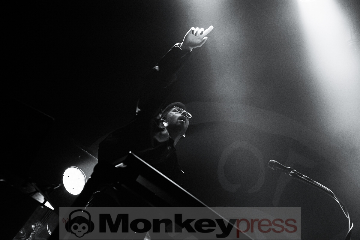 Pünktlich um 20:00 Uhr betrat der Special Guest, die britisch-deutsche Dark-Rock-Band Auger die Bühne und bereits nach den ersten Tönen ist klar: Die Band ist ein hervorragender Support für den Main Act! Mit rockigen, eingängigen Melodien gepaart mit Synthesizer-Klangteppichen und der gnadenlos markanten und fesselnden Stimme von Kyle Blaqk aka Kyle J. Wilson heizt Auger dem Publikum gehörig ein. Bereits beim ersten Song tanzt und singt das Publikum mit. Auger präsentieren einen Querschnitt ihres musikalischen Könnens, das sich am besten beschreiben lässt als Mischung aus Dark Rock, Dark Wave und Industrial Pop. Die Musik klingt vertraut, ein bisschen nostalgisch, wehmütig und doch so unvergleichlich frisch und neu! Abstrakt schön!